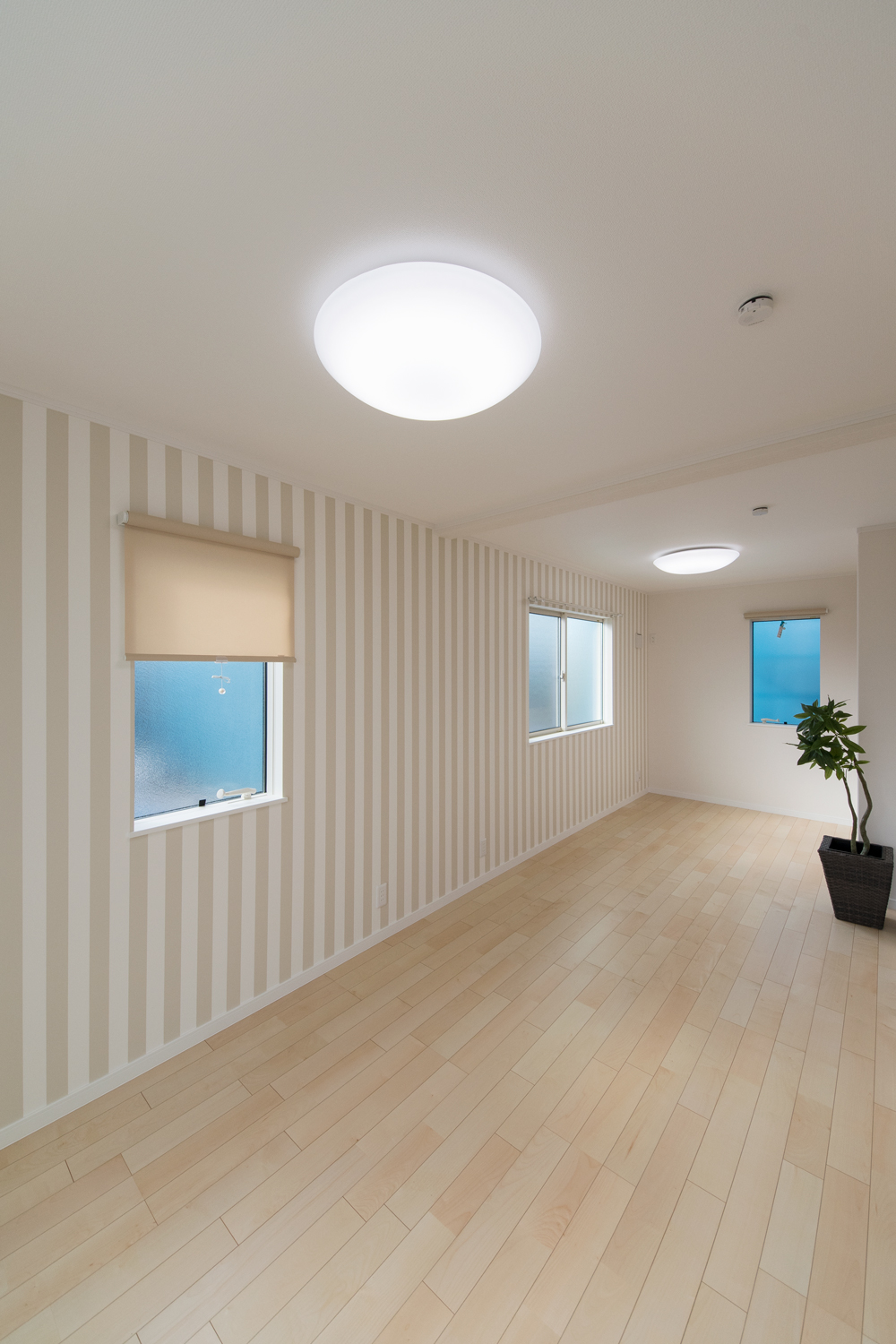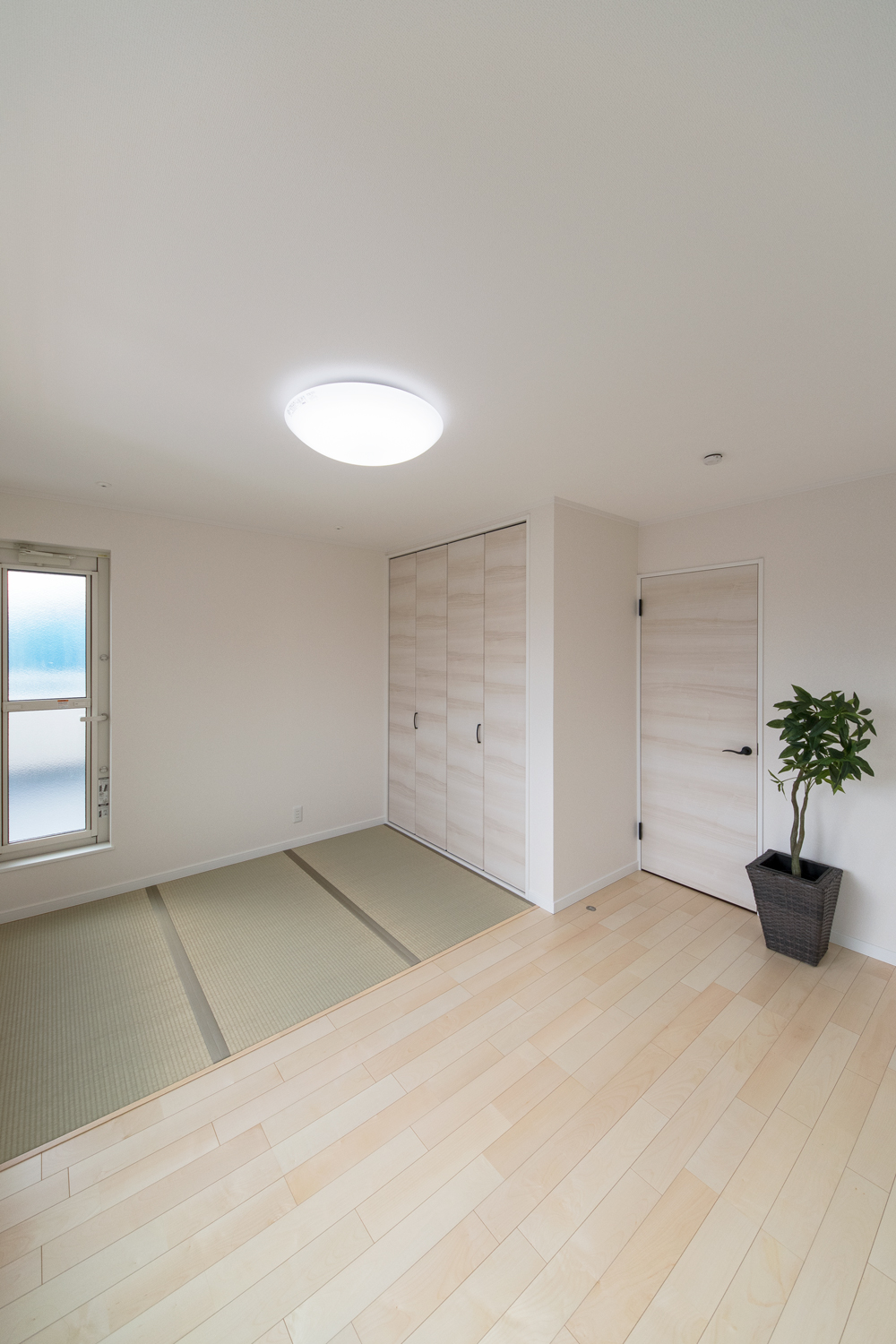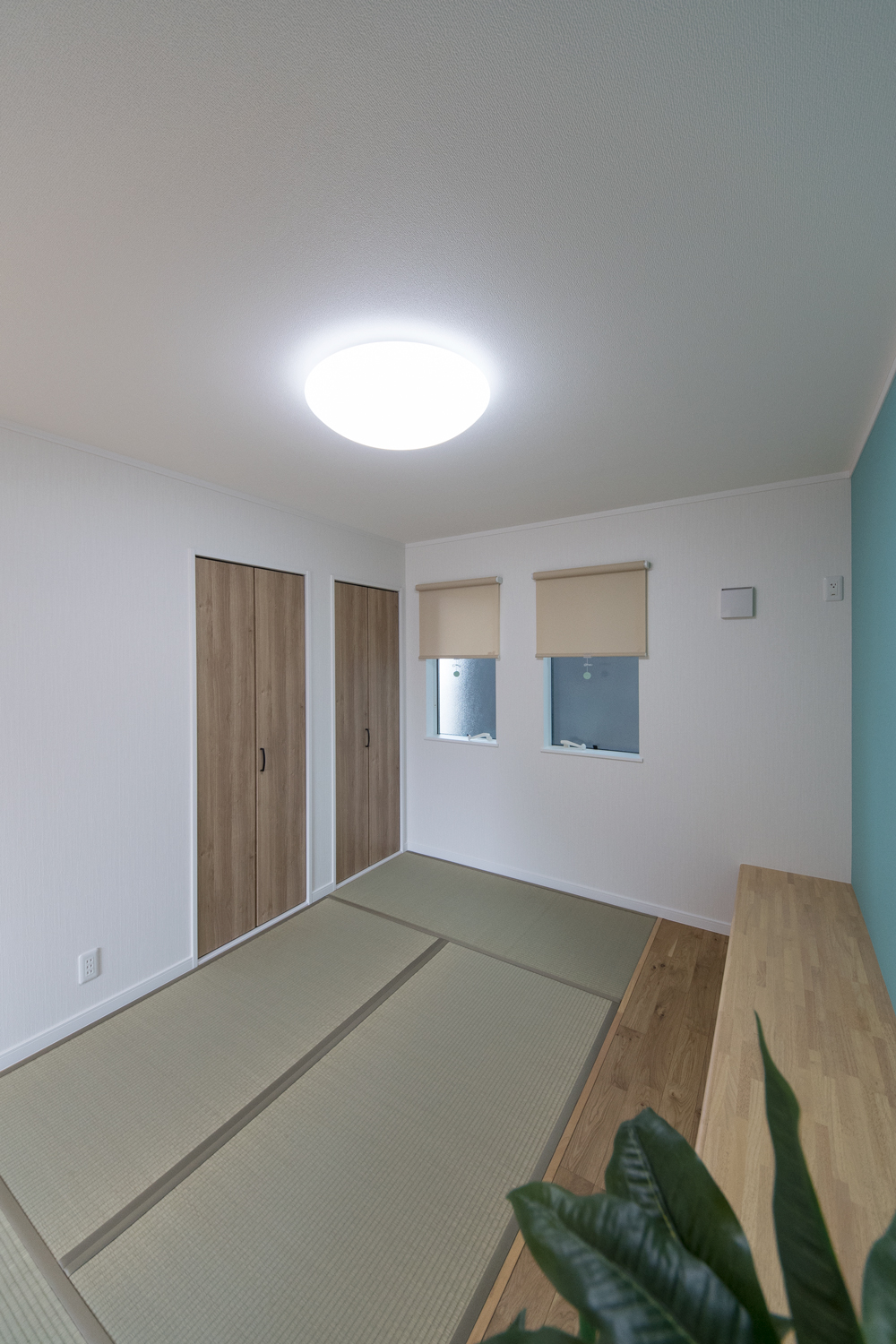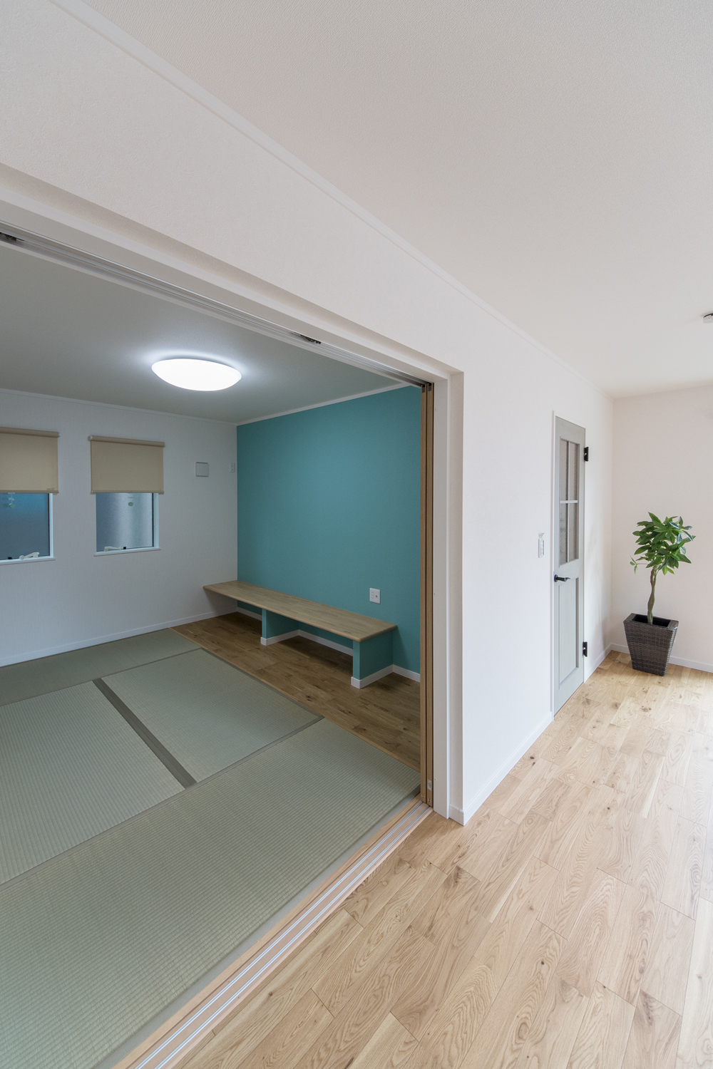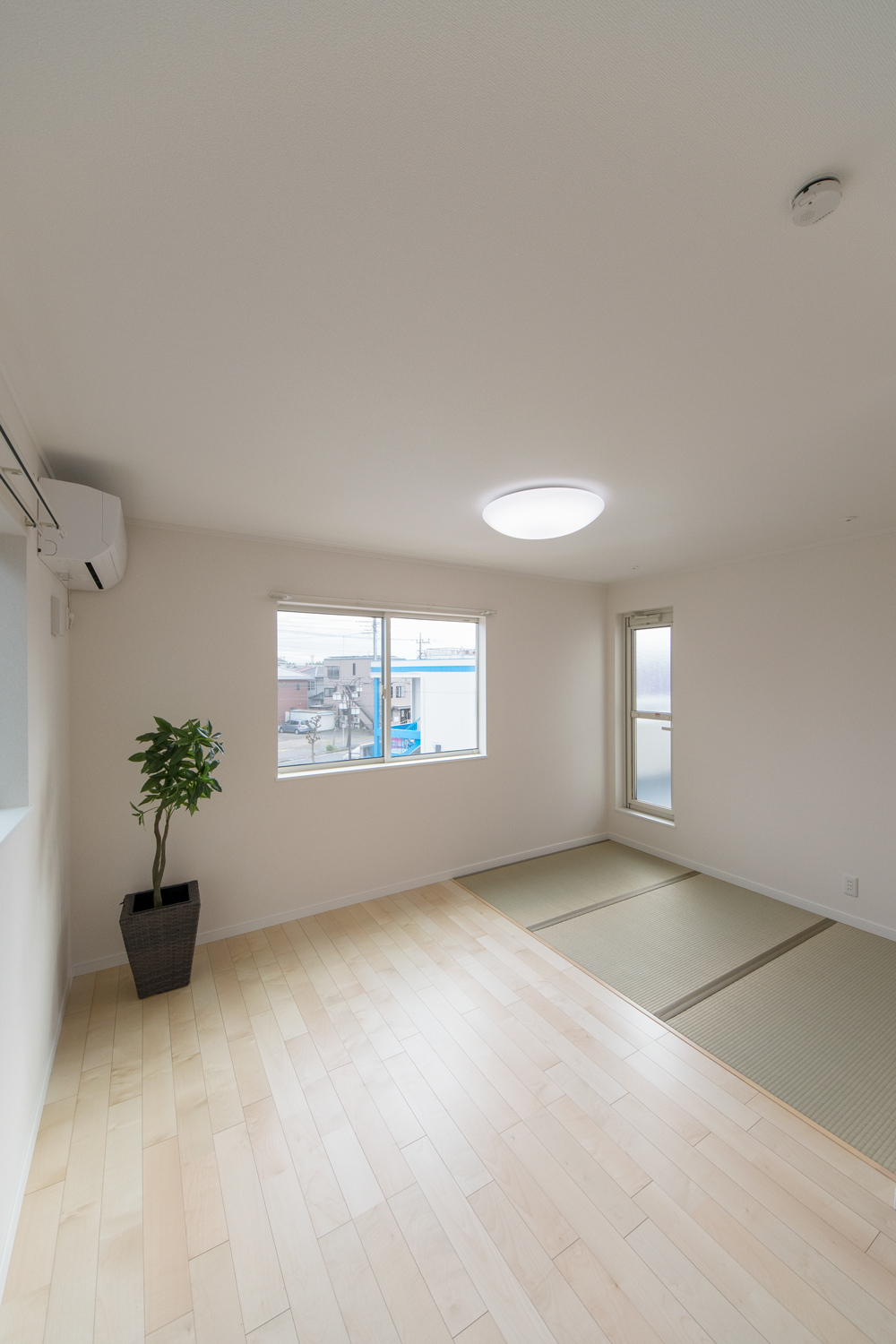 白を基調に、明るい木目調のサイディングをアクセントにした、ナチュラル&モダンな外観。室内には、便利な畳敷きスペースを設えました。床だと痛いけど、畳だとゴロンとできるから嬉しい♪フローリングもイイけど、畳もやっぱり好き!!癒しの空間が完成しました。