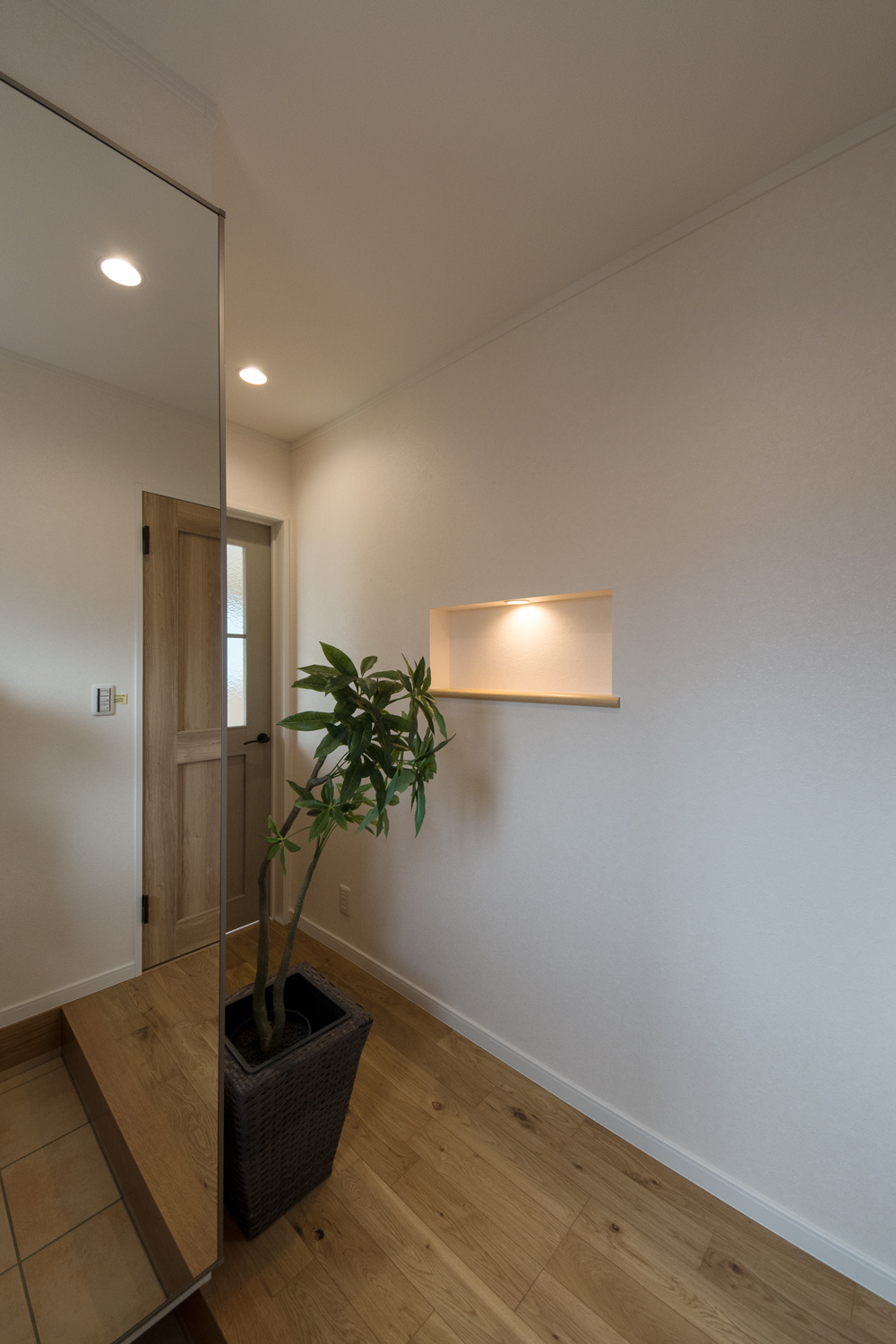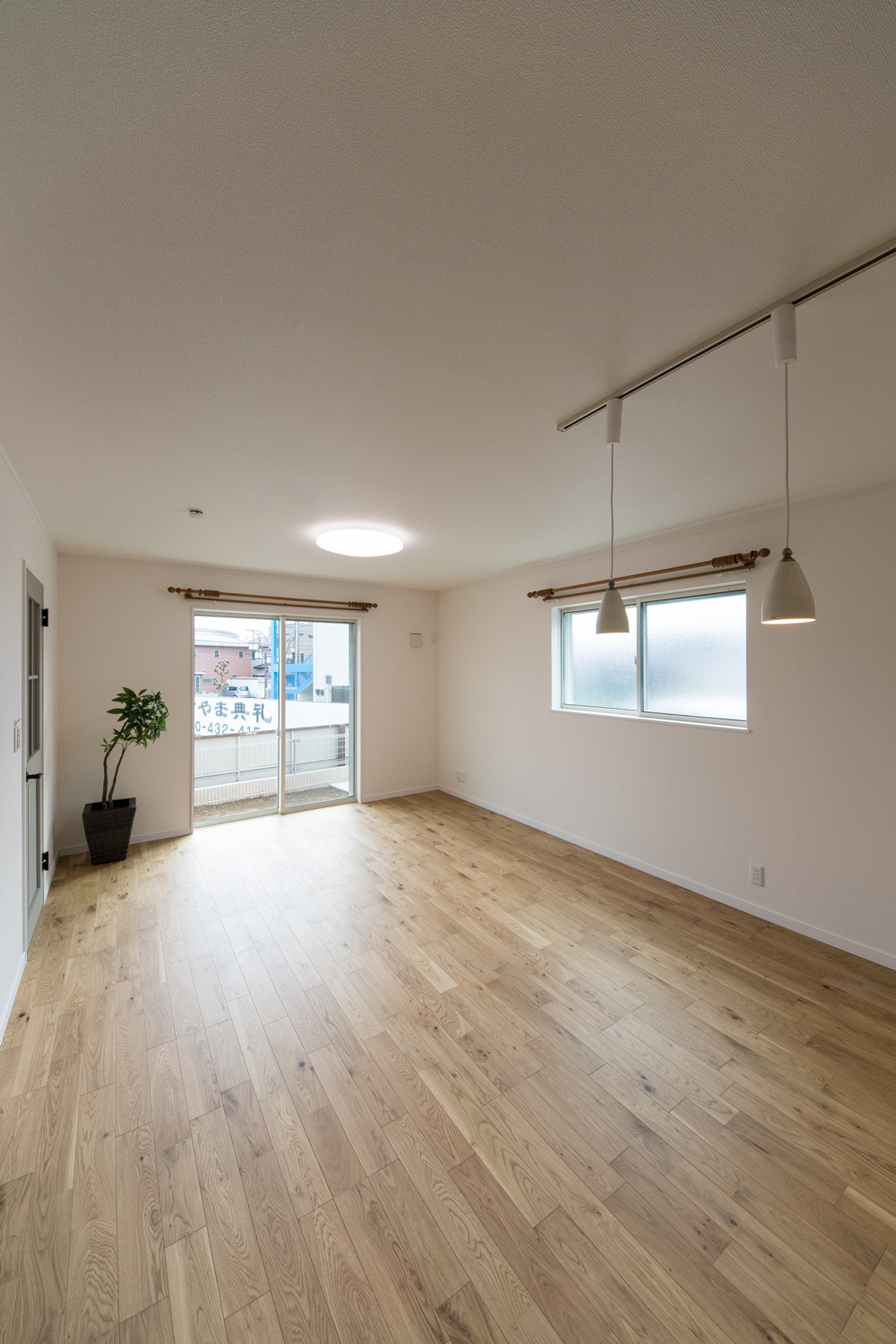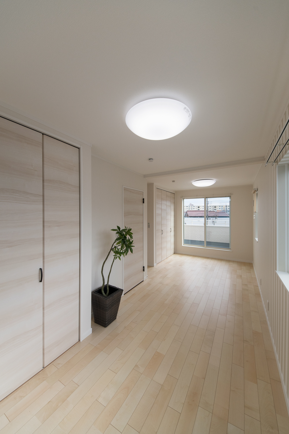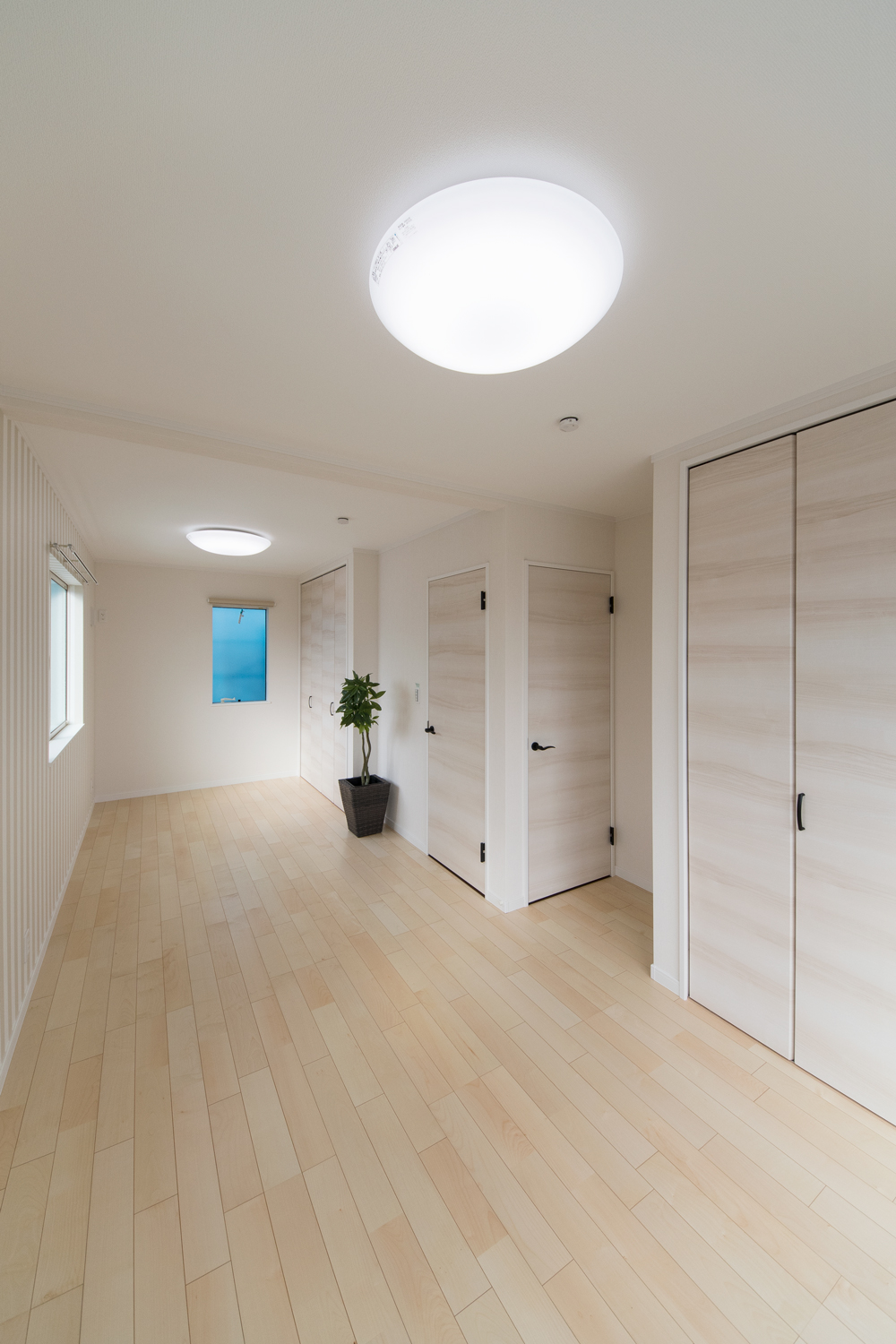 白を基調に、明るい木目調のサイディングをアクセントにした、ナチュラル&モダンな外観。室内には、便利な畳敷きスペースを設えました。床だと痛いけど、畳だとゴロンとできるから嬉しい♪フローリングもイイけど、畳もやっぱり好き!!癒しの空間が完成しました。