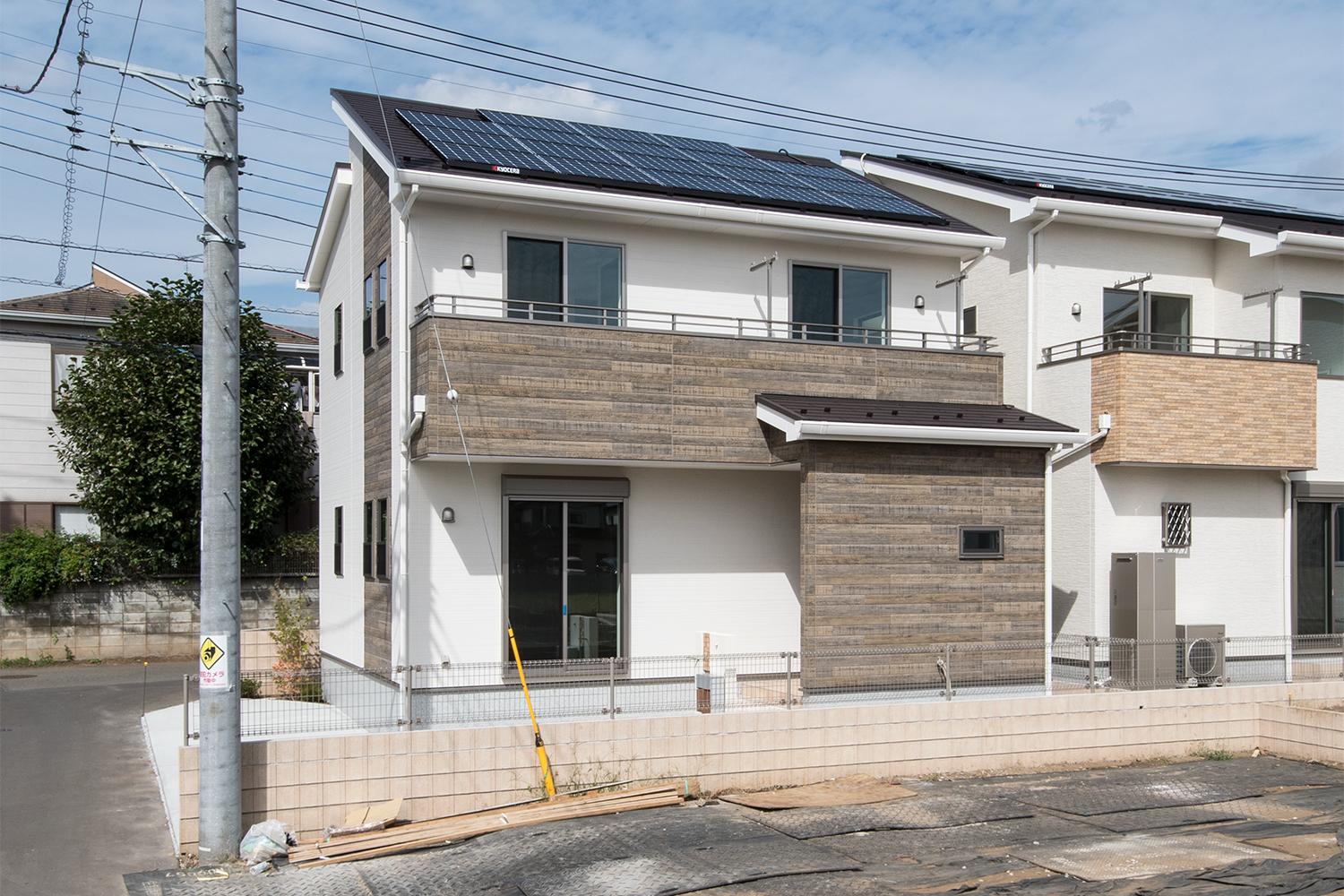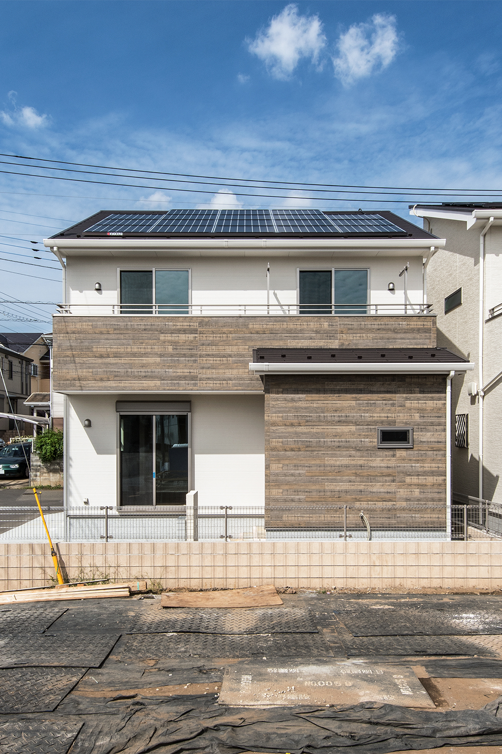 白を基調に、表情豊かな木目調のサイディングをアクセントにした、ナチュラルモダンな外観。