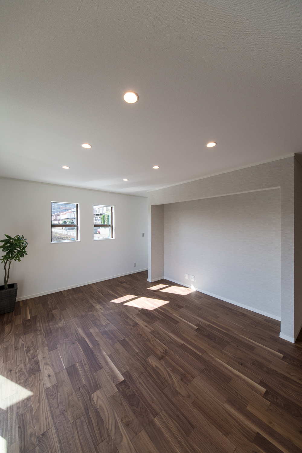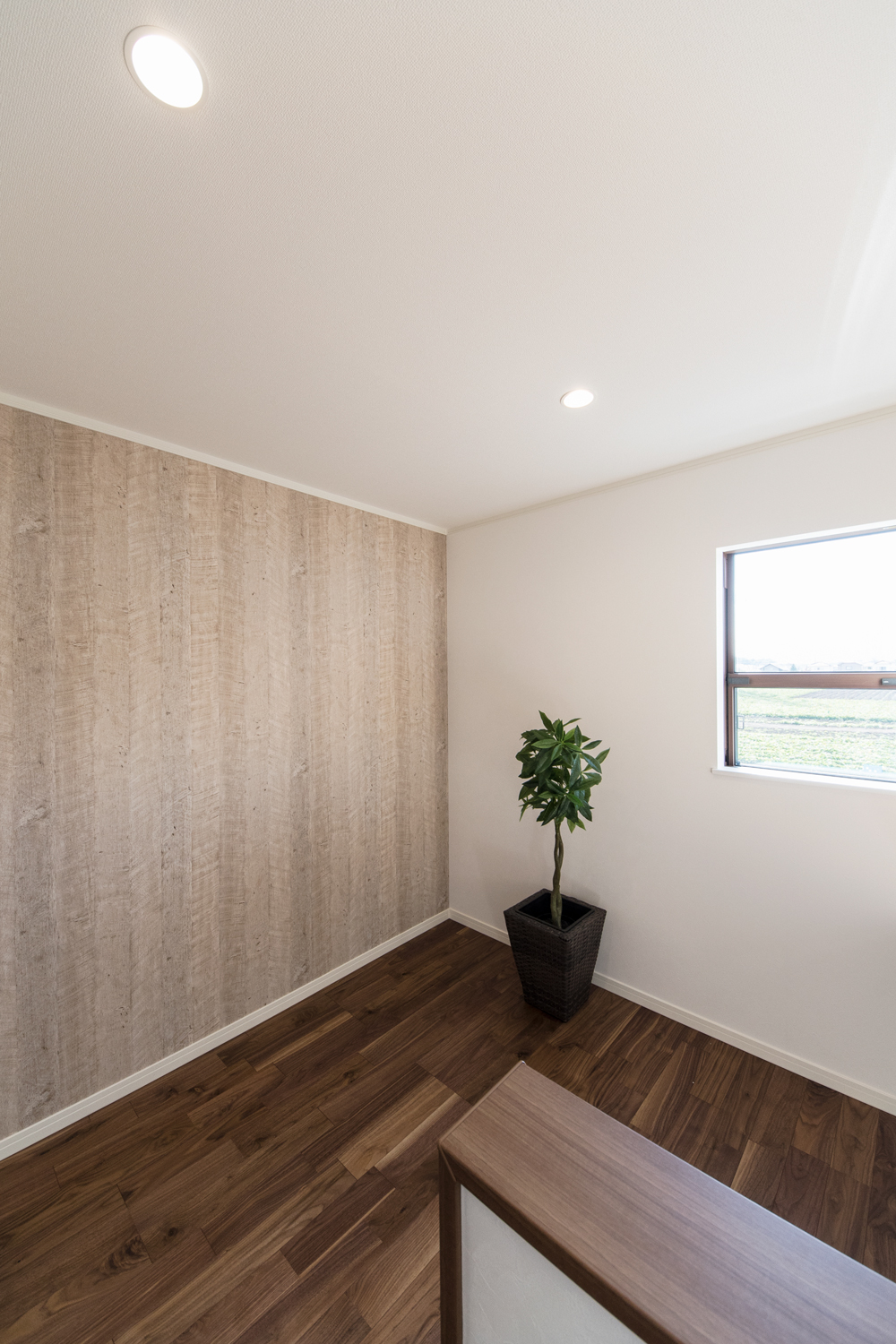 2階フリースペース/木目柄のアクセントクロスがスタイリッシュな空間を演出。