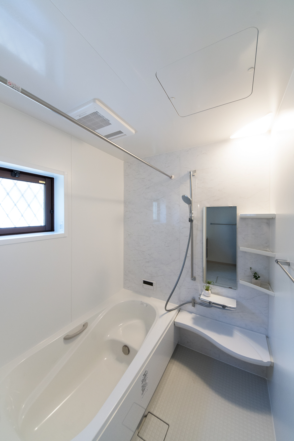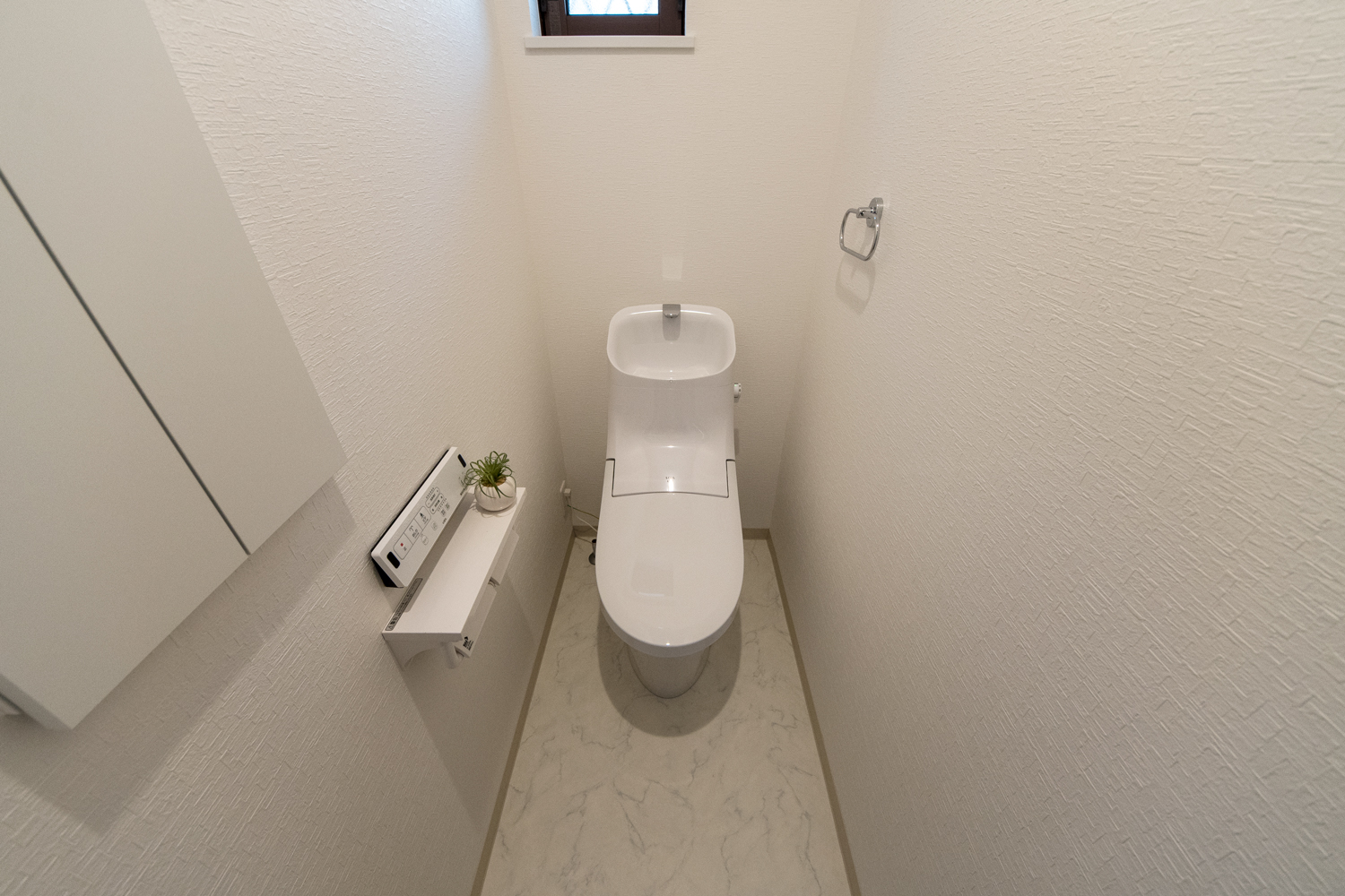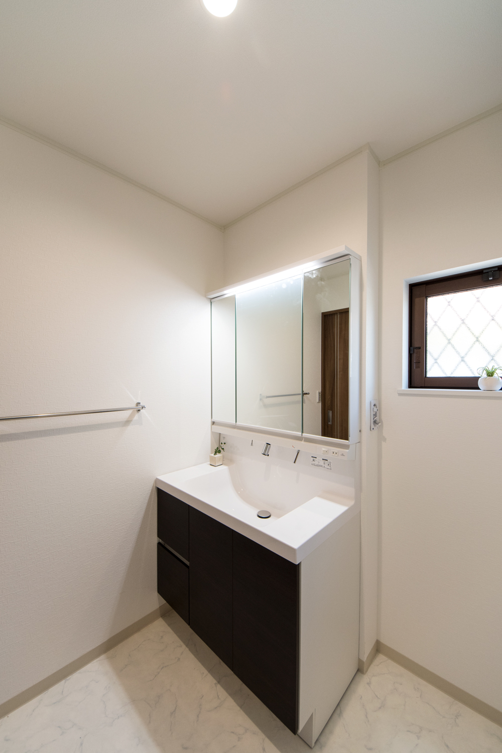 白を基調とした清潔感のあるサニタリールーム。洗面化粧台扉をダークブラウンでアクセントに。