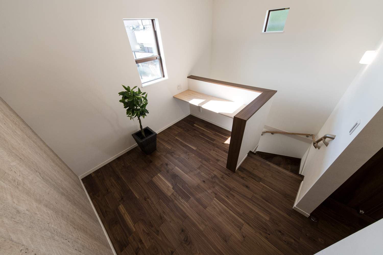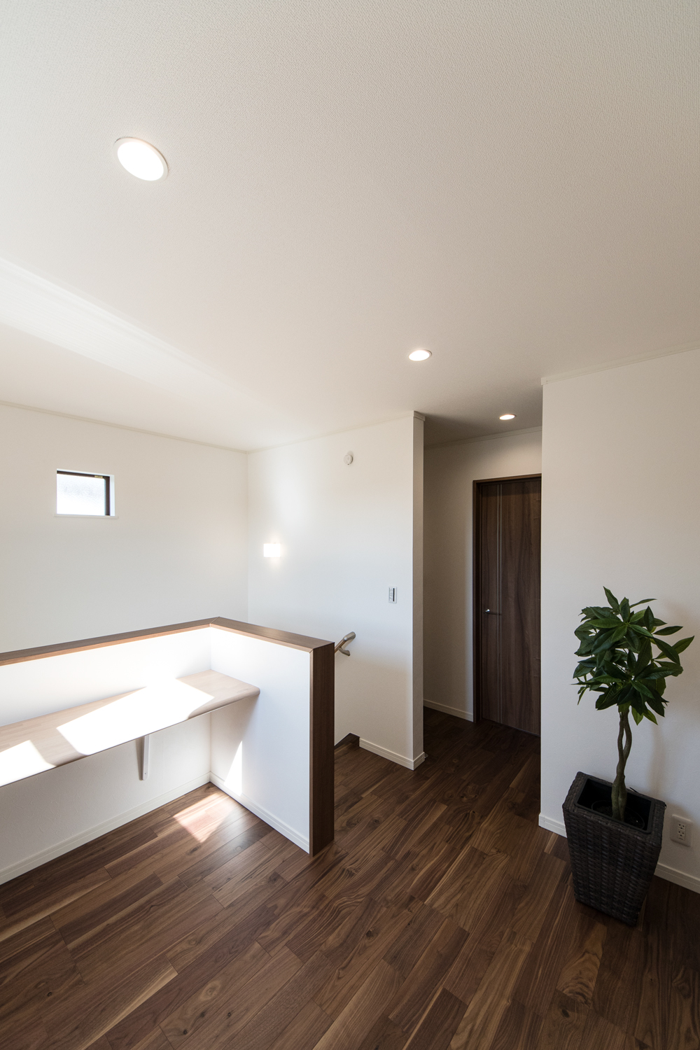 2階フリースペース/2階ホールの一角にカウンターを施しました。オープンな書斎にしたり、家族みんなの共用場所に♪