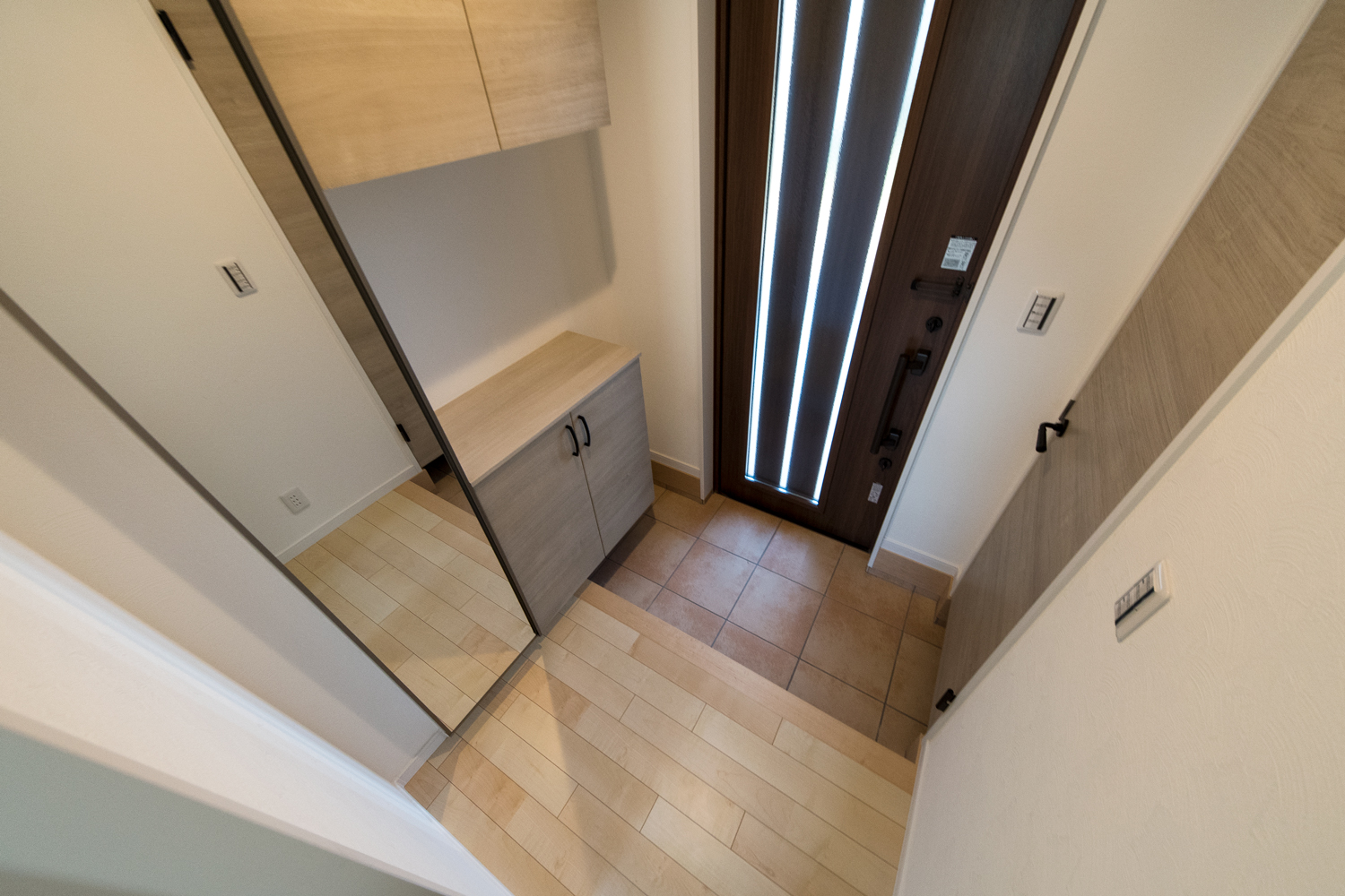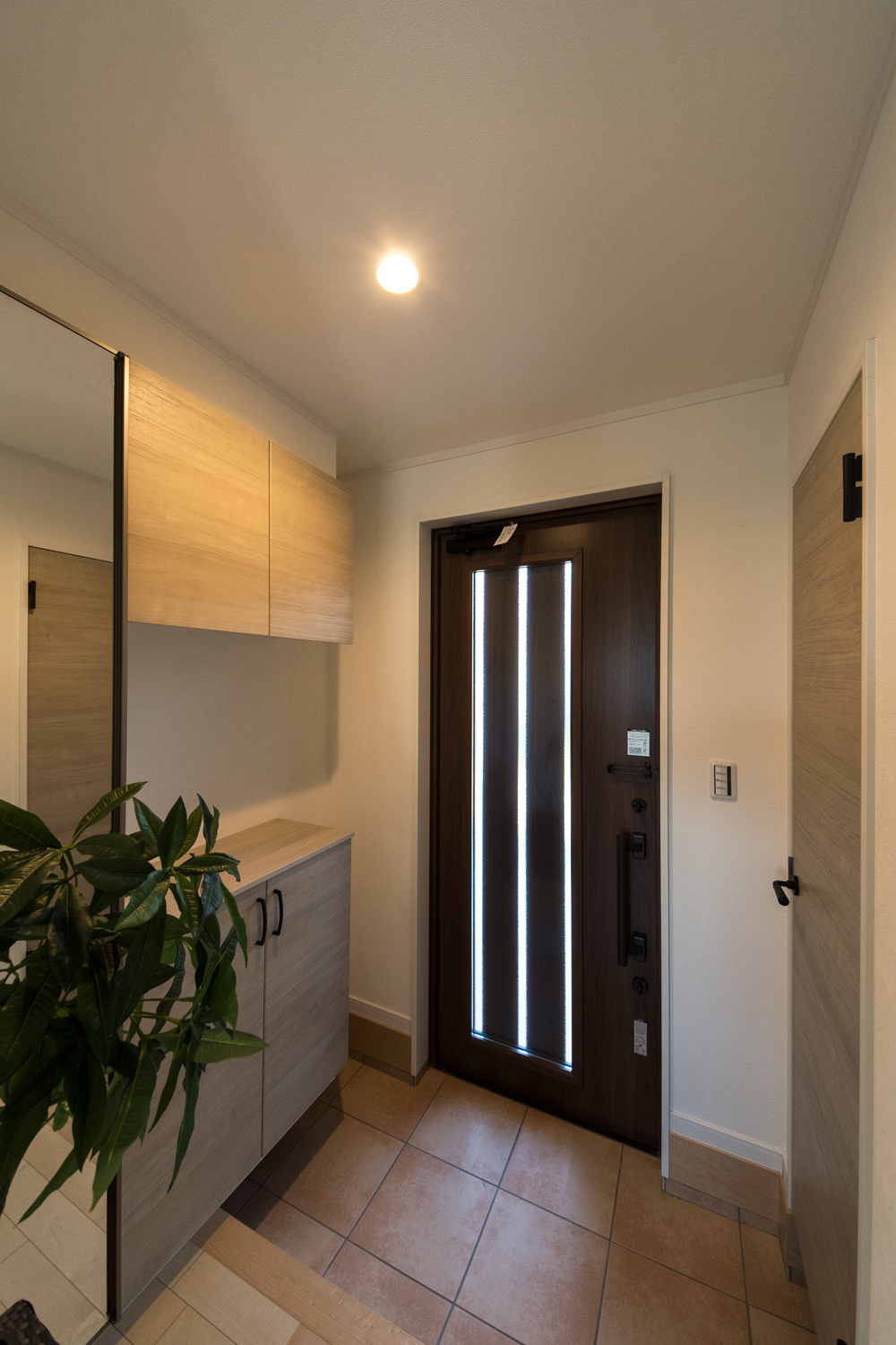 木目調の玄関収納とベージュのテラコッタ調タイルがナチュラルな雰囲気を演出。