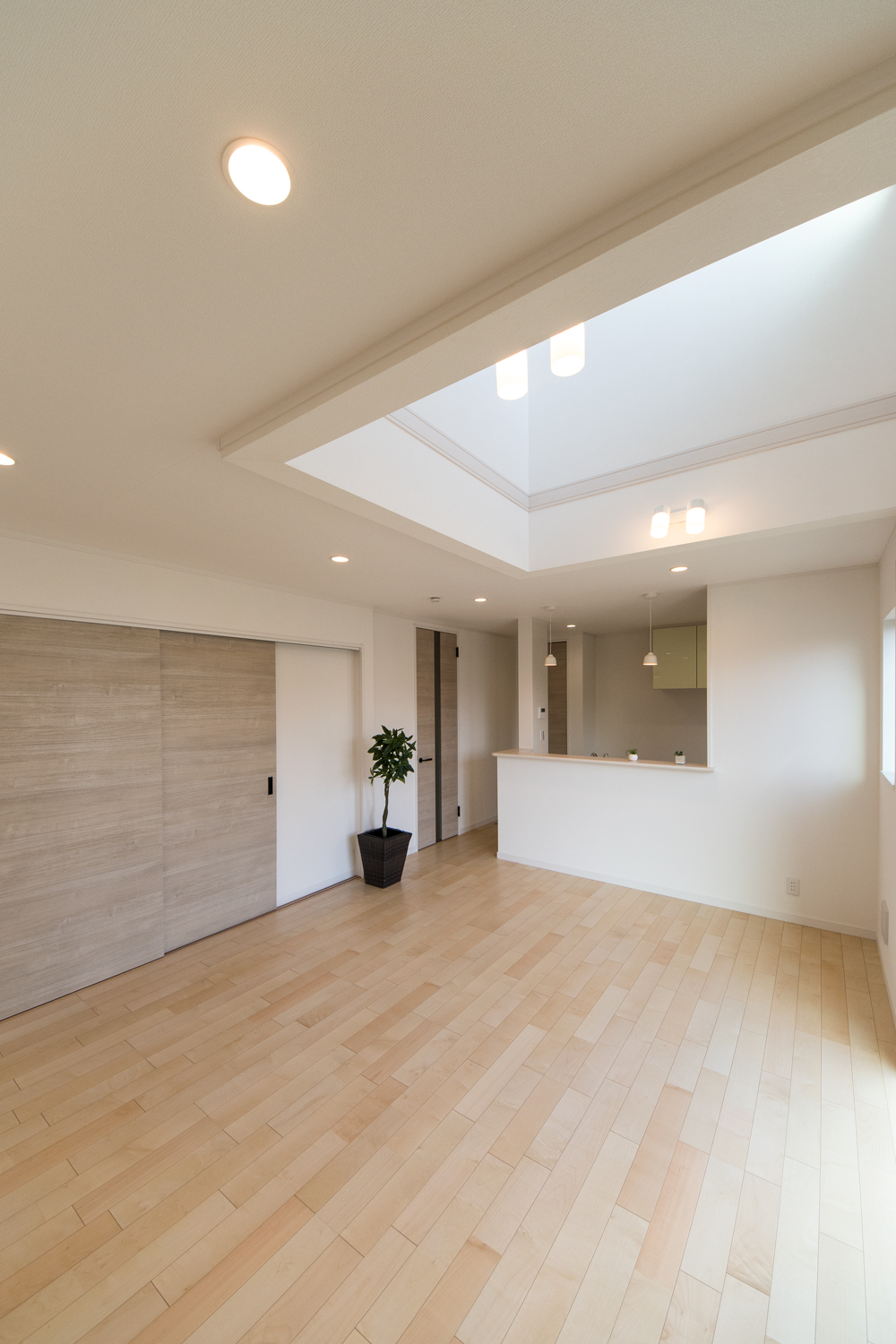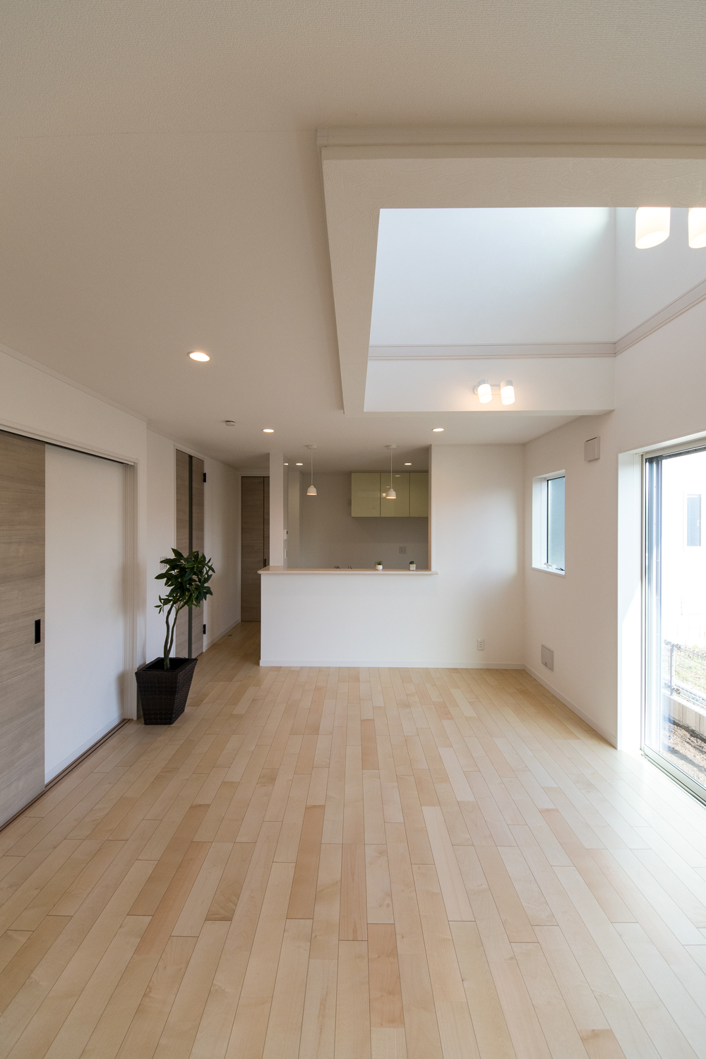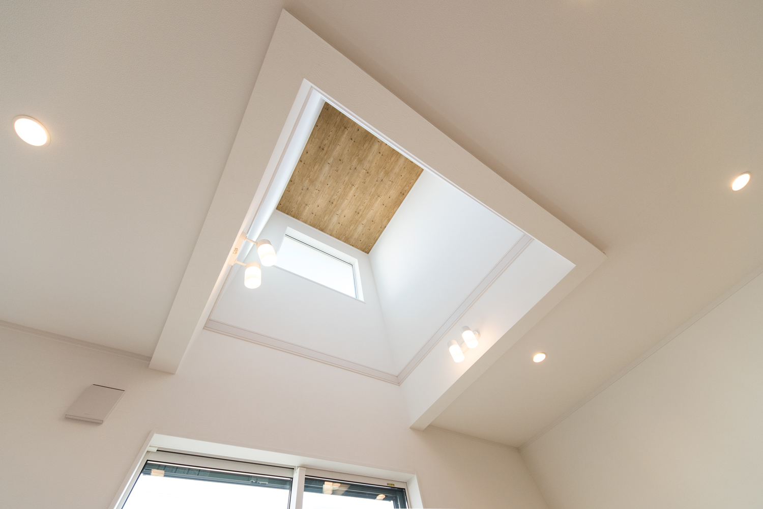 吹抜け部分に、枠で囲んだ様なデザインの下がり壁を施し、トップライトを設置しました。奥行きと立体感が出ました。