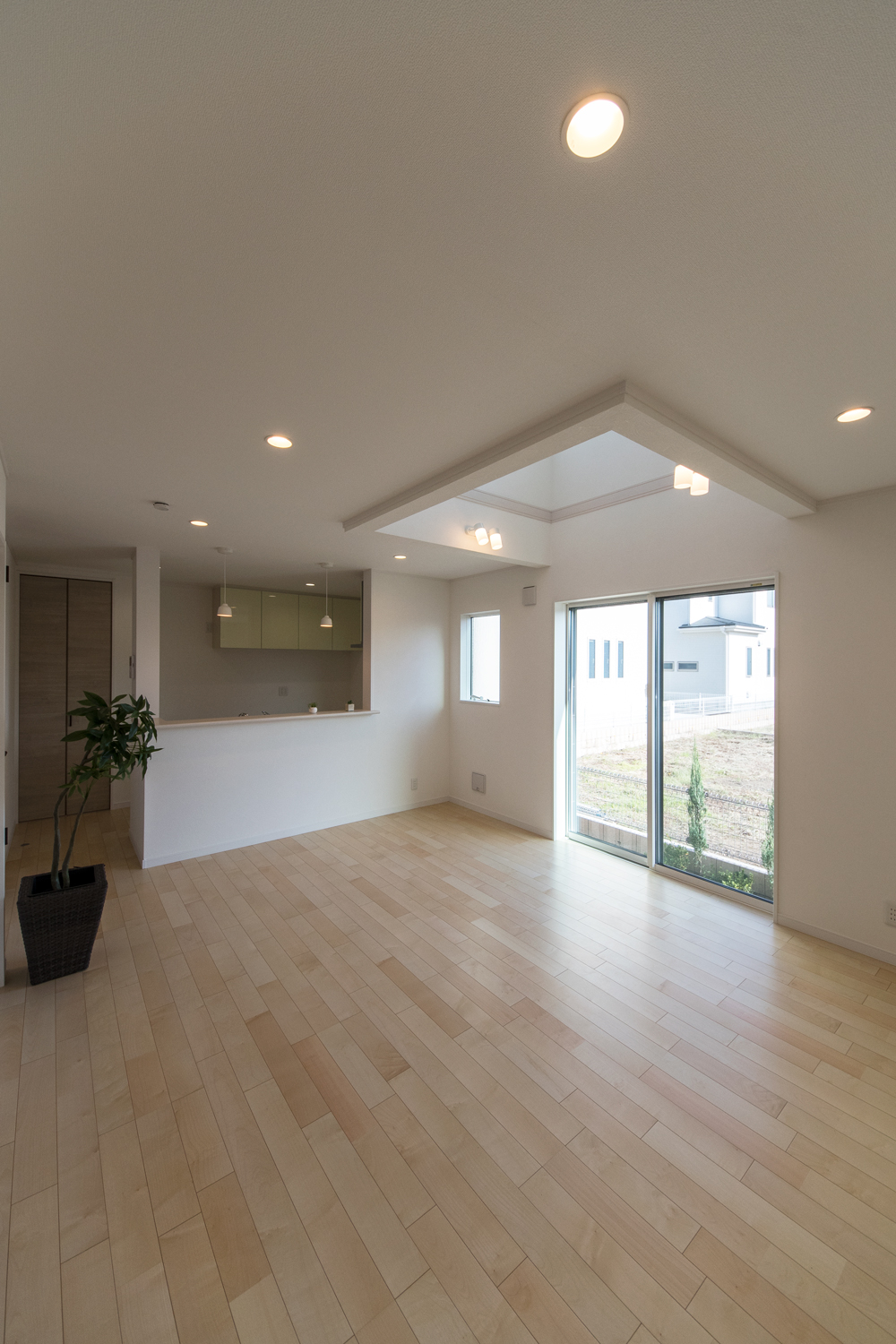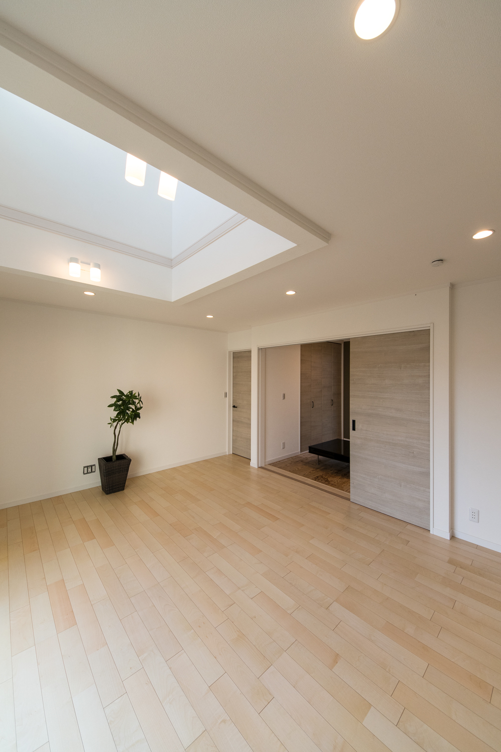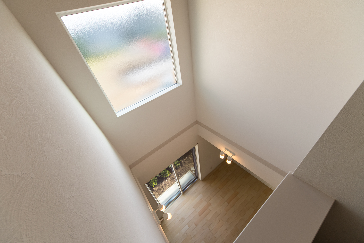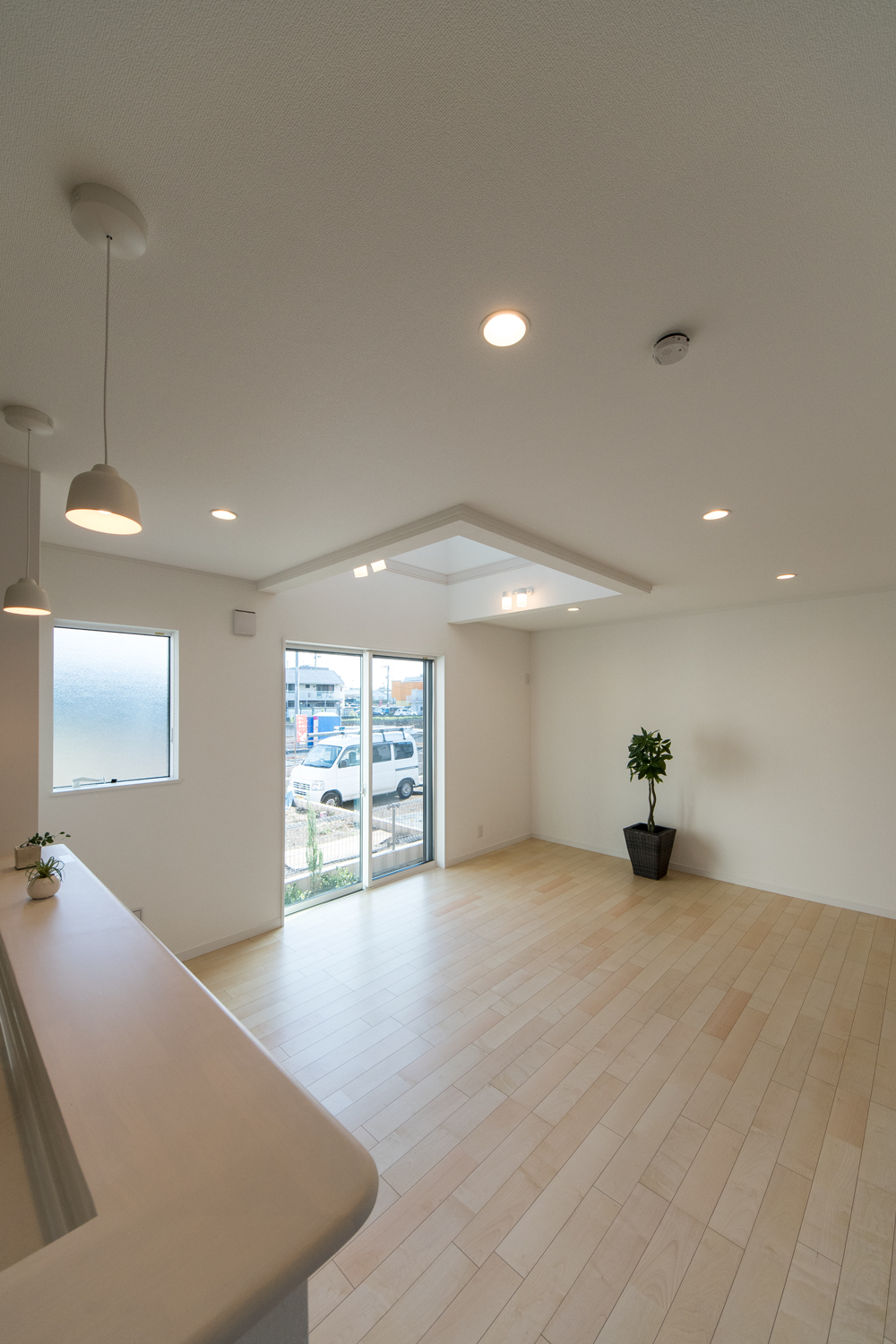 吹抜け部分に、枠で囲んだ様なデザインの下がり壁を施し、トップライトを設置しました。奥行きと立体感が出ました。