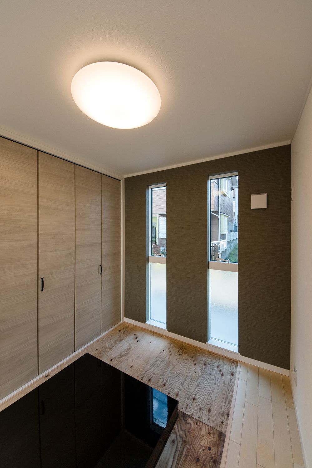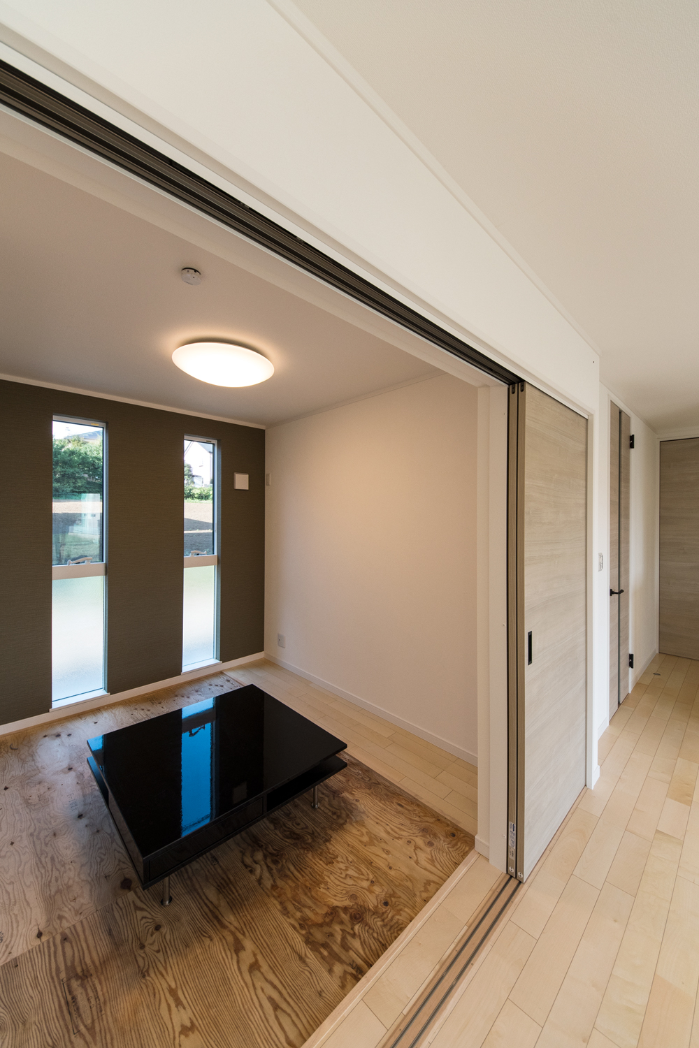 1階畳敷き洋室(写真は畳設置前)/シックな配色のアクセントクロスと二連の縦窓を施したモダンな和空間。