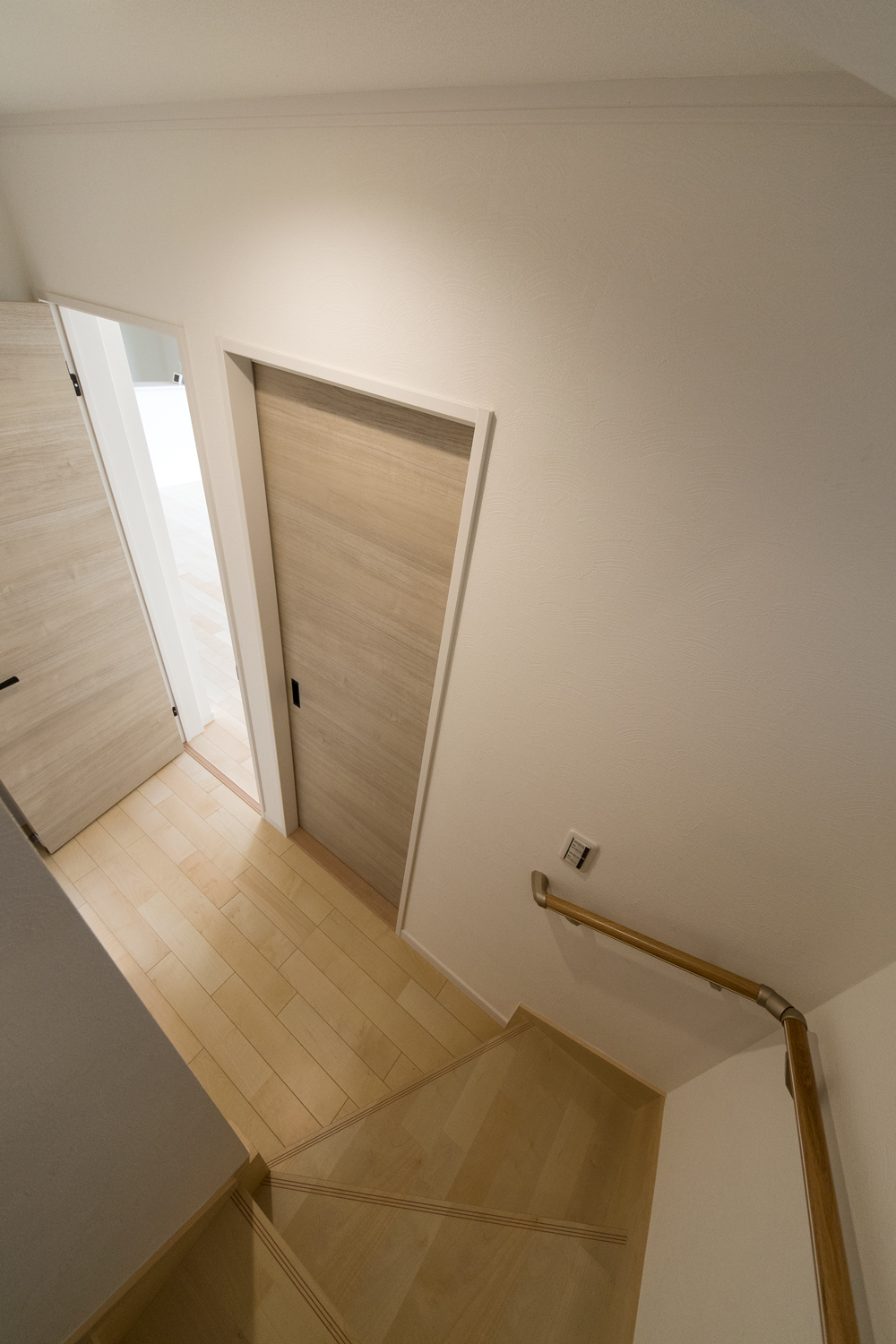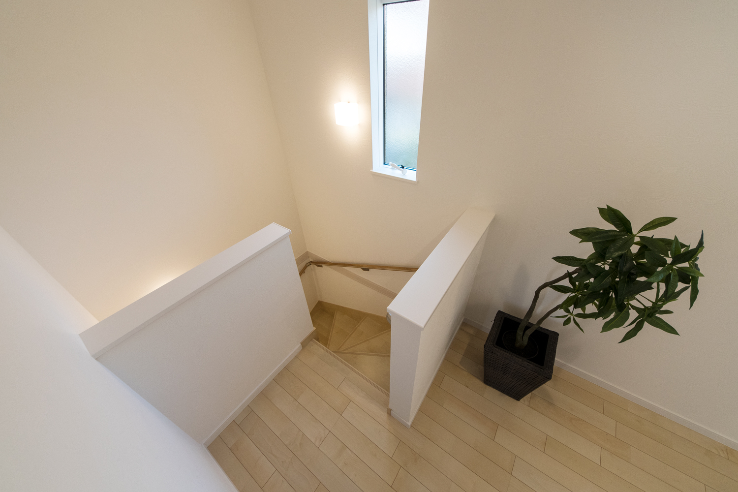 「玄関→リビング→ホール→階段→2階」リビングを必ずと通って2階へ。家族が自然と顔を合わせる間取りです。