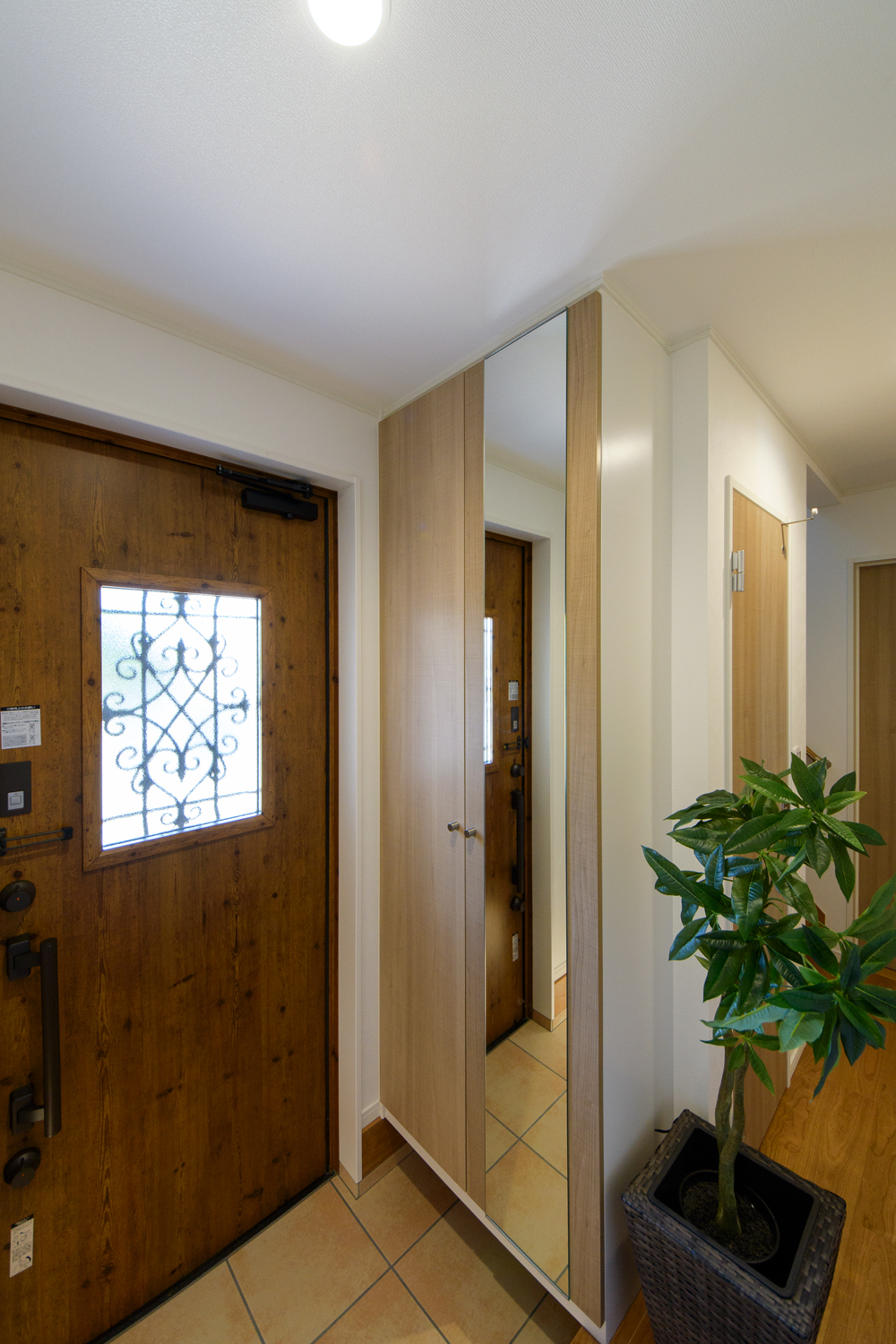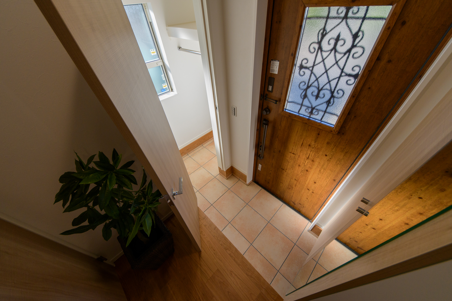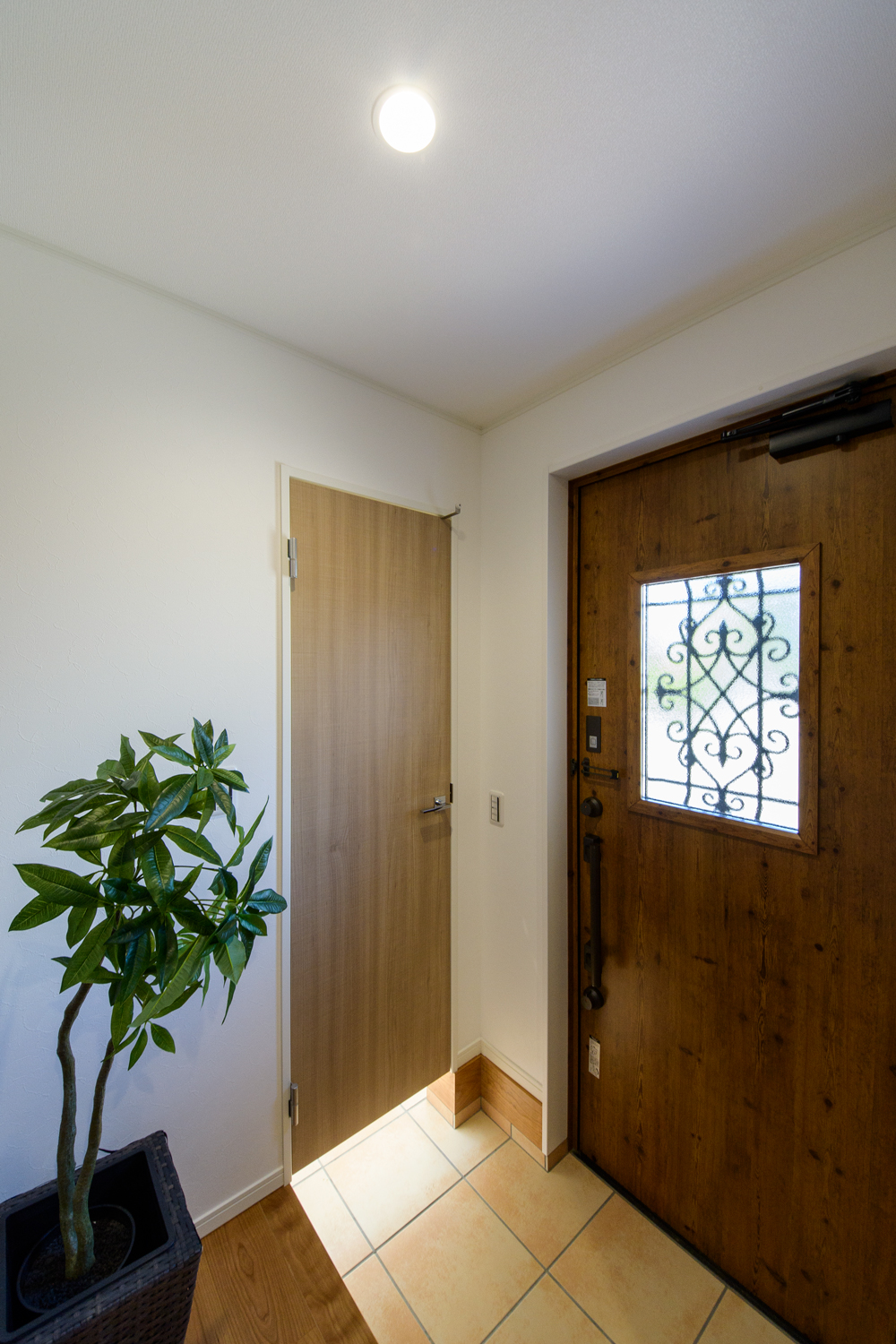 木の温もり感じるナチュラルな配色の玄関。窓から自然の光が入ります。