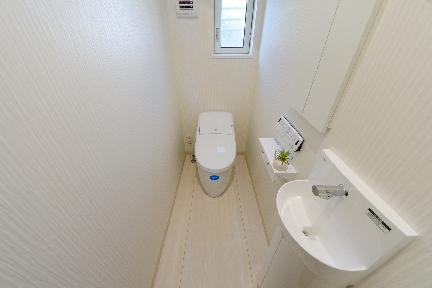 1階トイレ/タンクレストイレで広々快適な空間を演出しました。独立タイプの手洗付きでお客様をおもてなしできます。