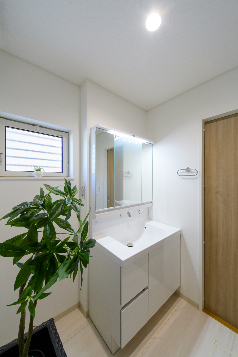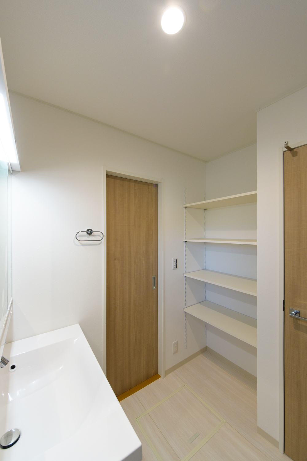 白を基調とした清潔感のあるサニタリールーム。汚れや水に強い大理石柄のフロアを施しました。