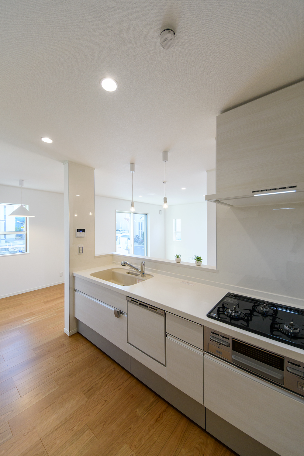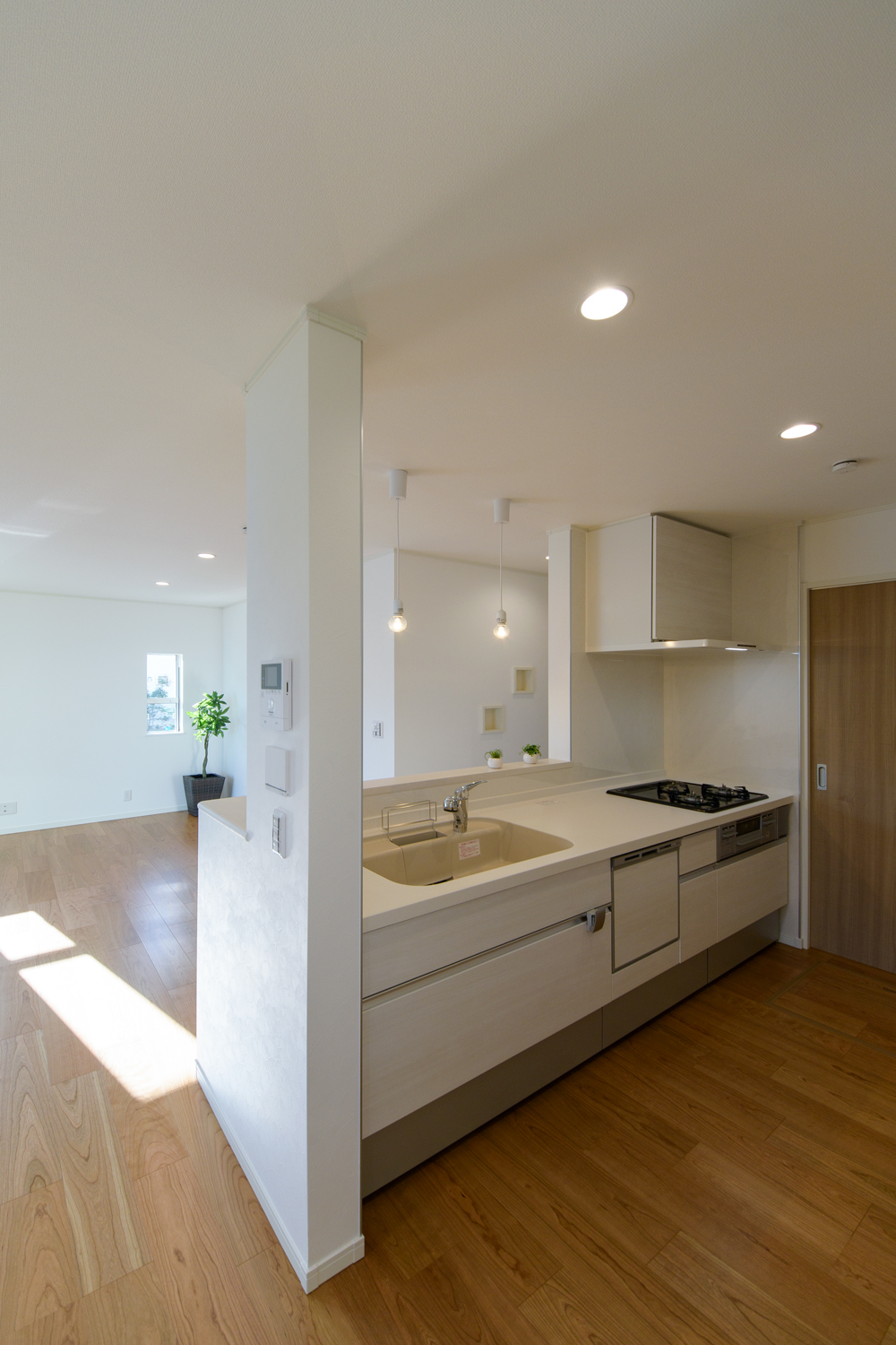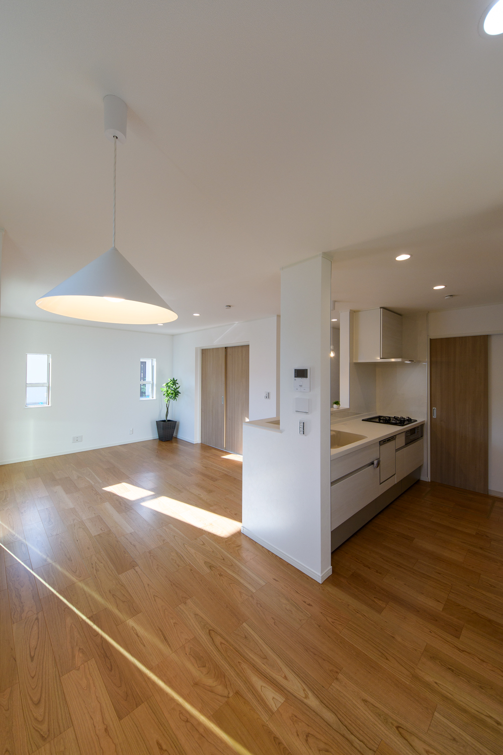 キッチンから、リビング見渡せる、開放的で一体感のある間取り。