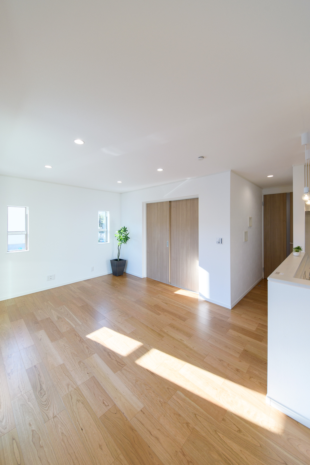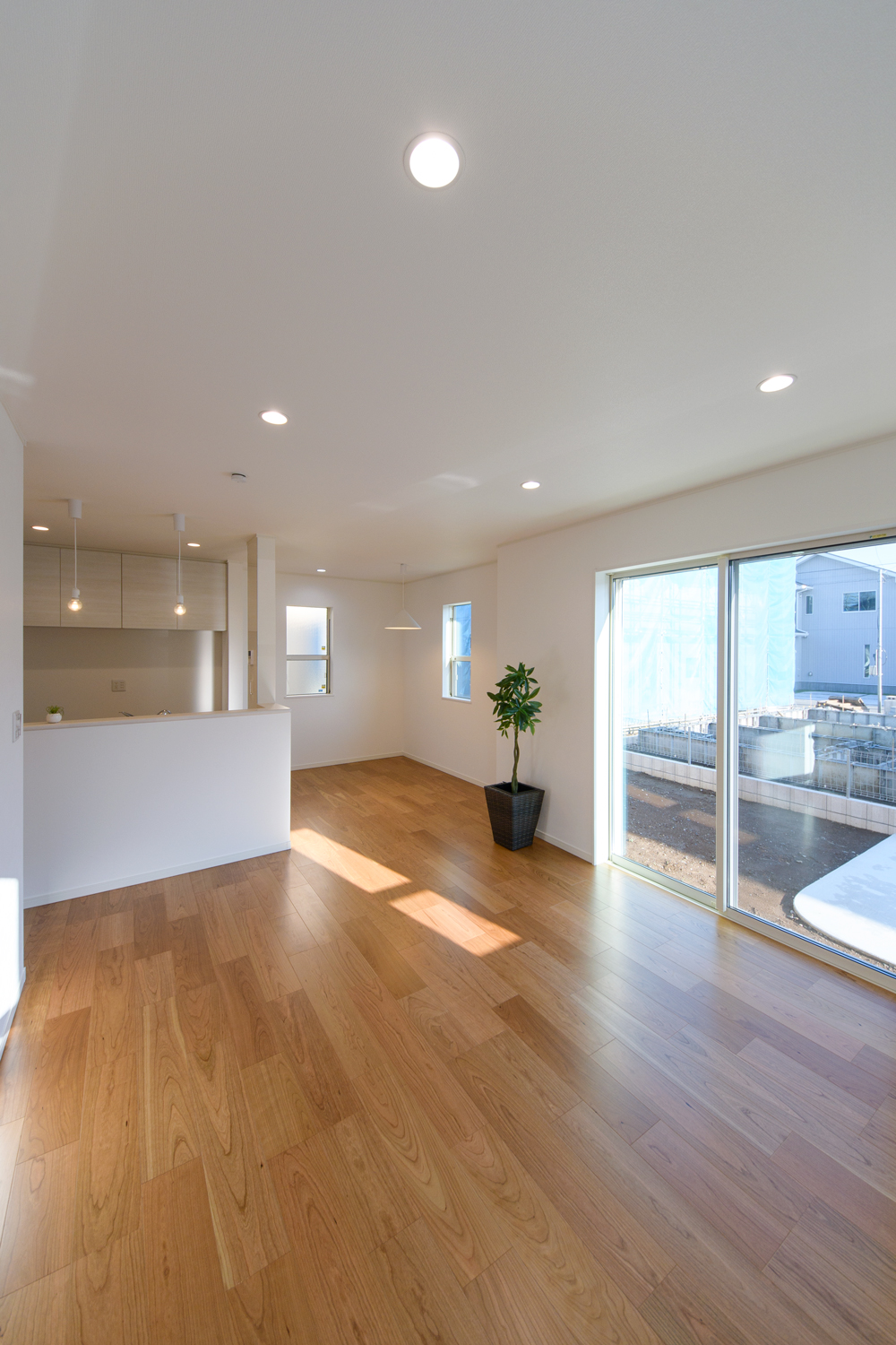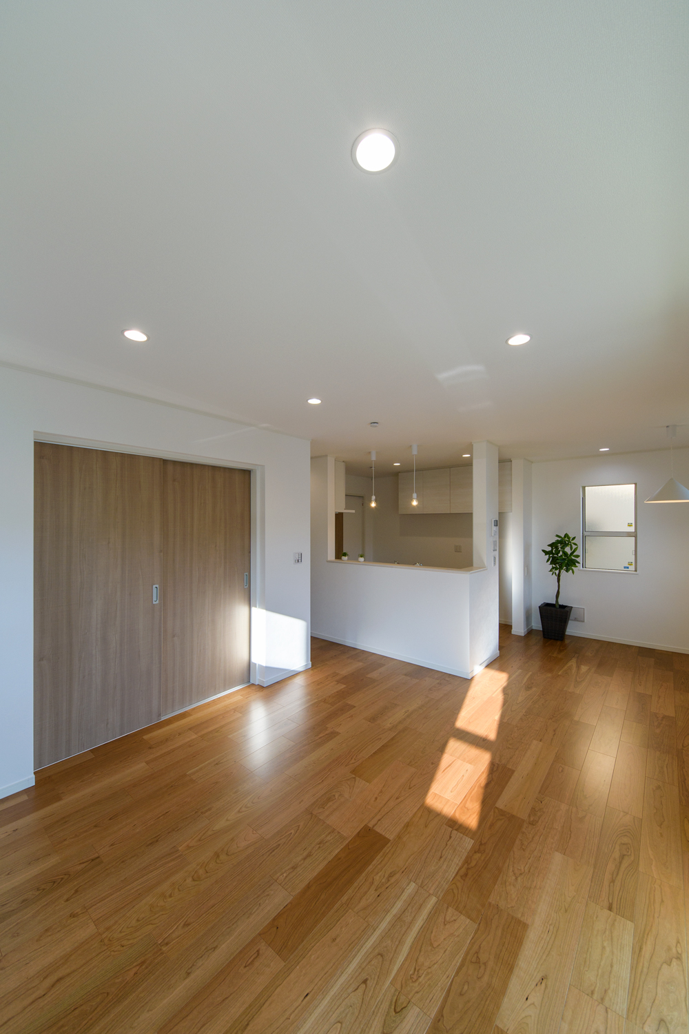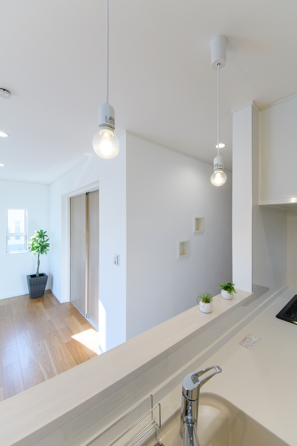 キッチンから、リビング見渡せる、開放的で一体感のある間取り。
