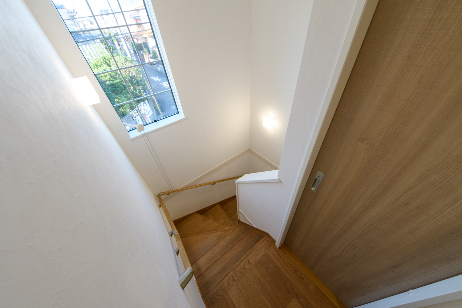 オシャレな組子入り窓を設えた、明るく開放感のある階段。