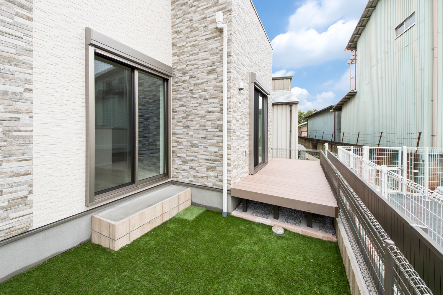ウッドデッキと人工芝を設えました。人工芝なのでお手入れもラクラクです♪