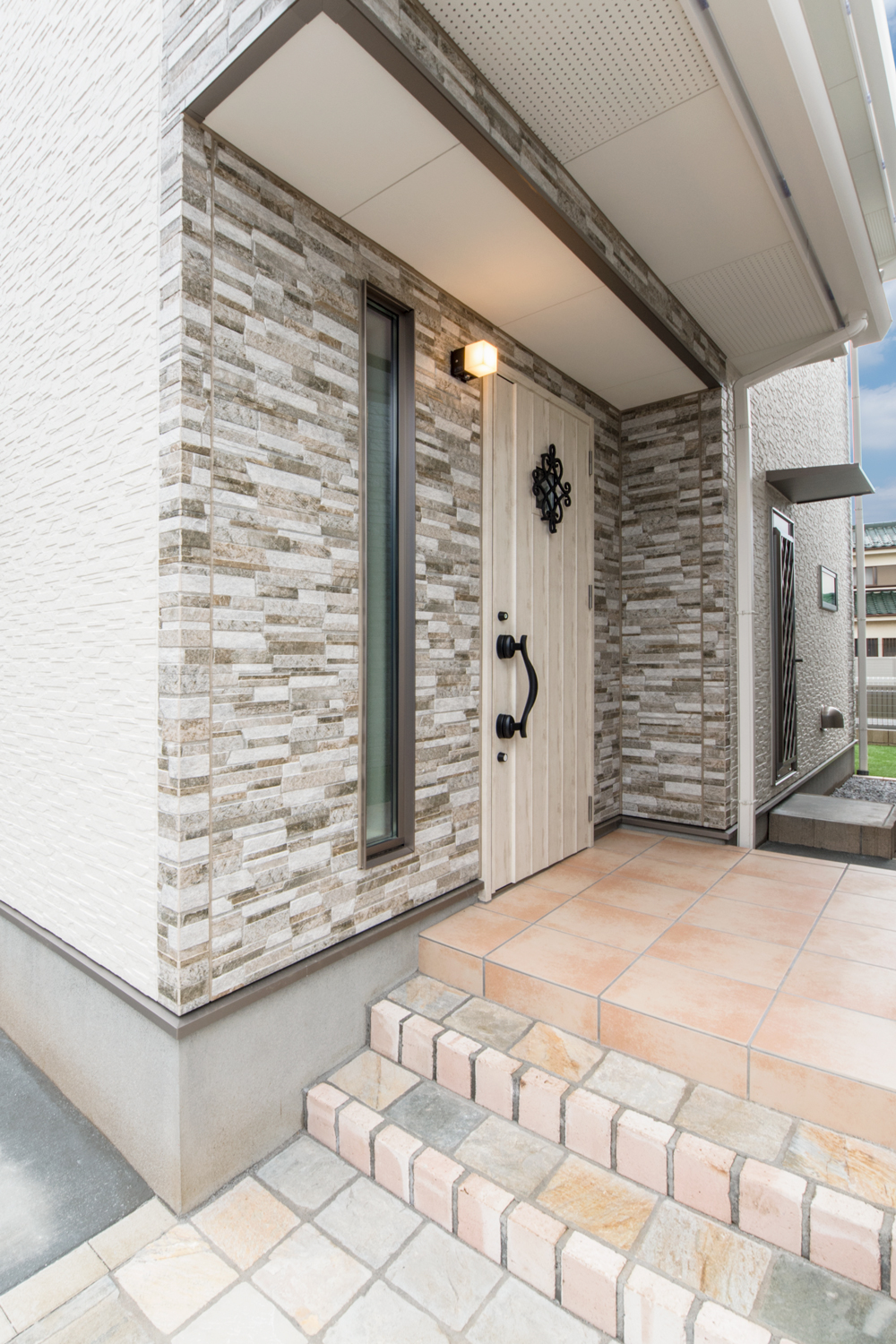 柔らかな花柄がモチーフの鋳物を施したドアと、周りにあしらった表情豊かなサイディングが、あたたかみのある雰囲気に。