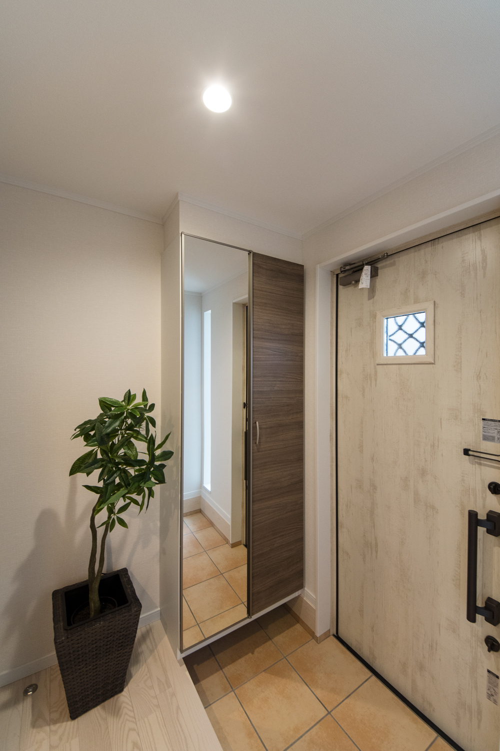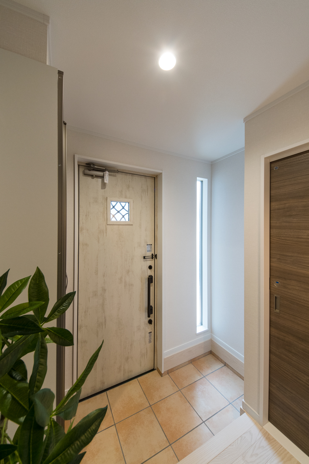 アイボリーの玄関扉とベージュのテラコッタ調タイルがナチュラルな雰囲気を演出。