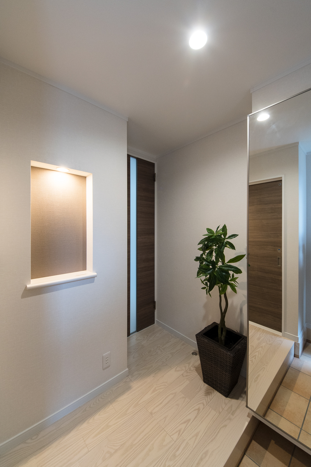 玄関ホールに小物を飾るニッチを設えました。アイテムに光を当てて、より雰囲気のあるインテリアを演出できます。