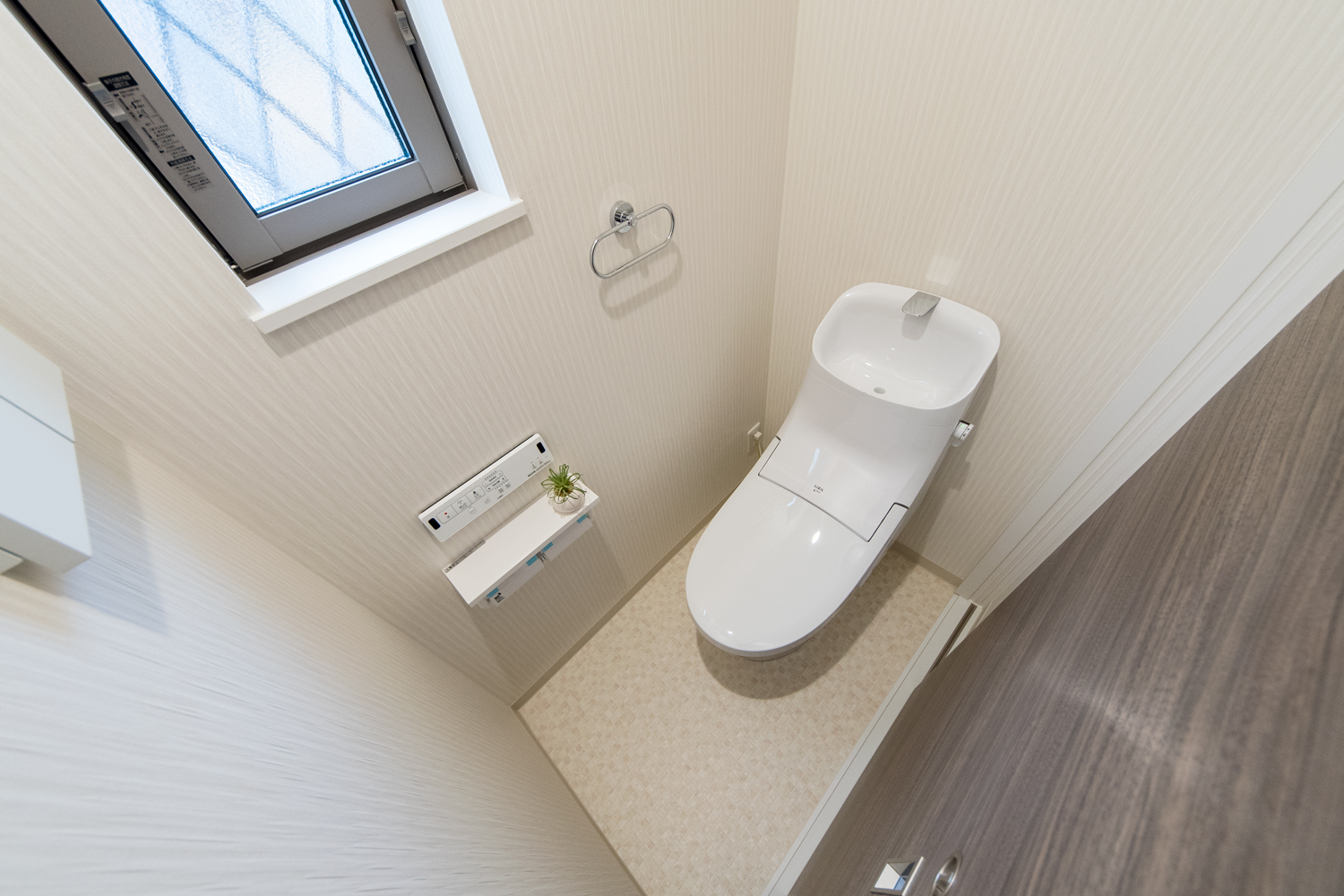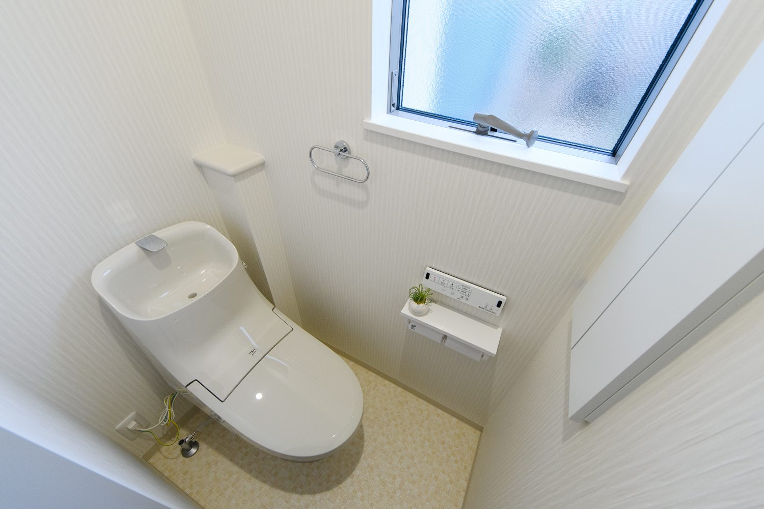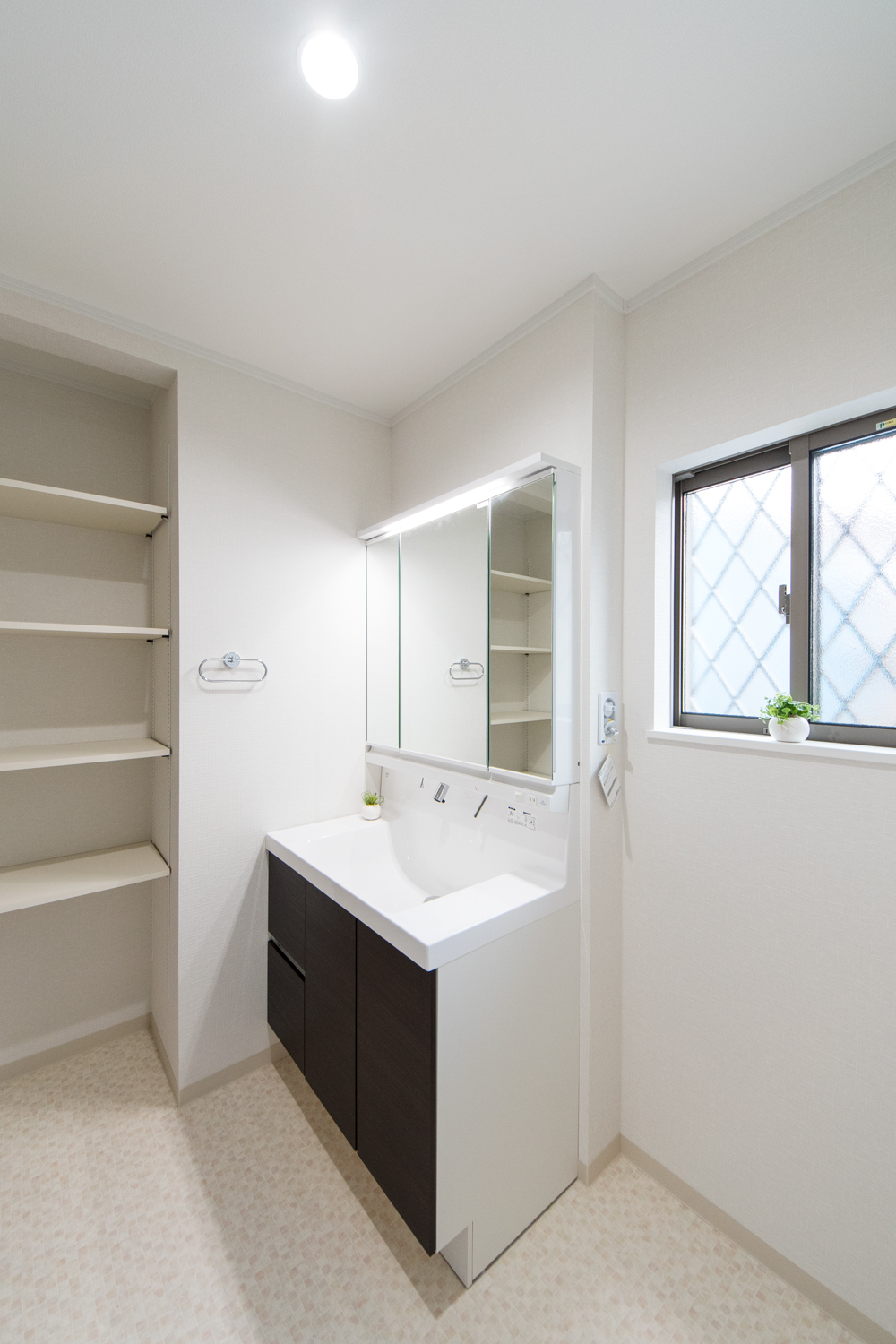 白を基調とした清潔感のあるサニタリールーム。洗面化粧台扉をダークブラウンでアクセントに。