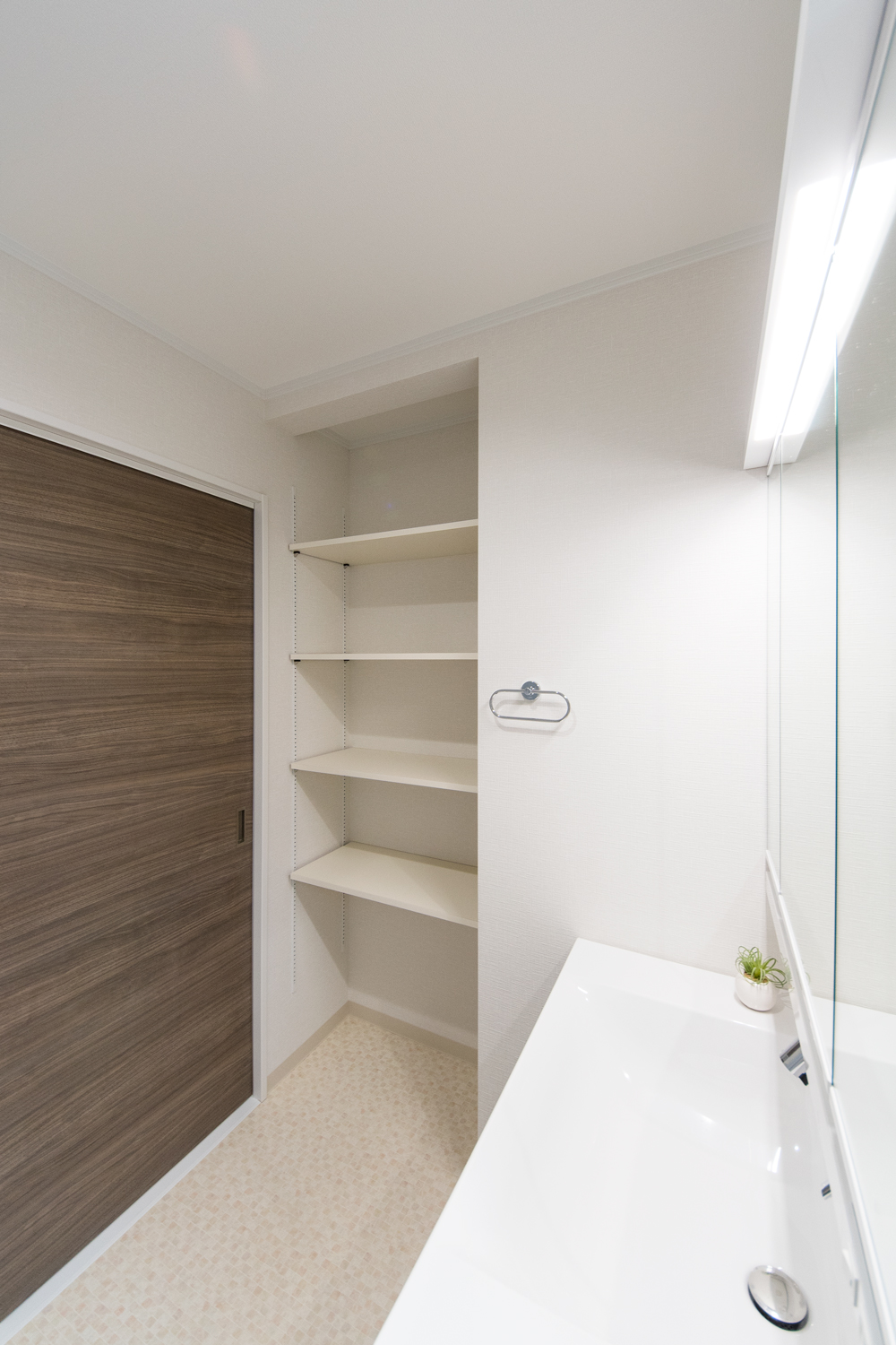 タオルや洗剤等をたっぷり収納できるリネン棚を設置したサニタリールーム。