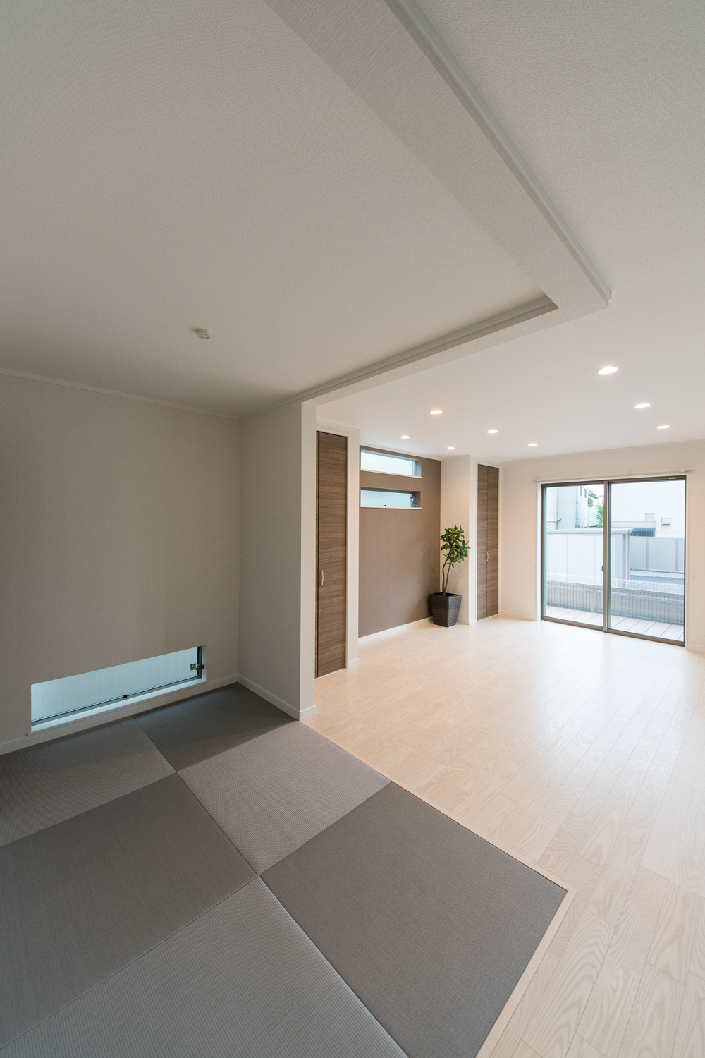 グレーの畳を市松敷きに。モダンな印象に仕上がった1階畳敷きスペース。