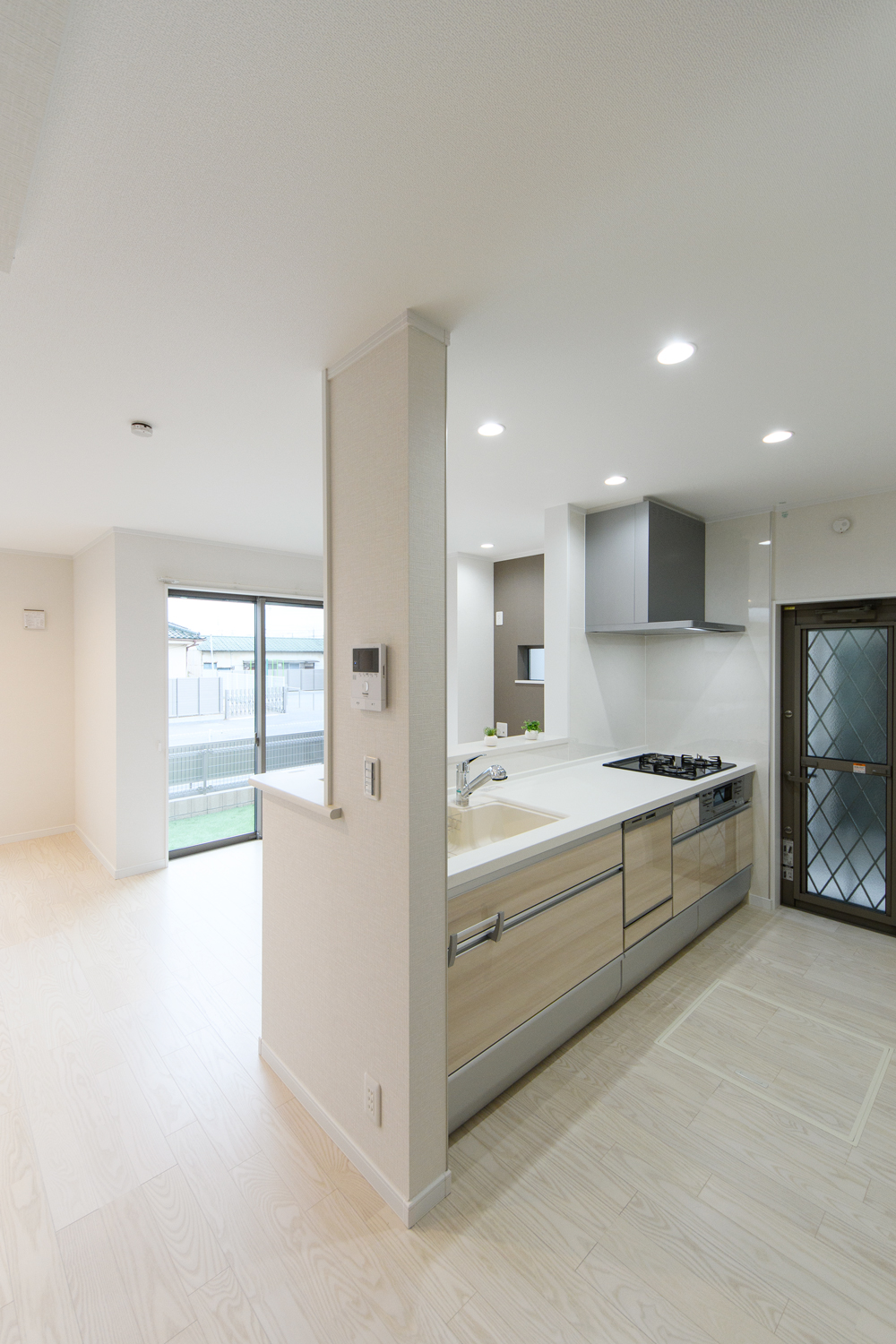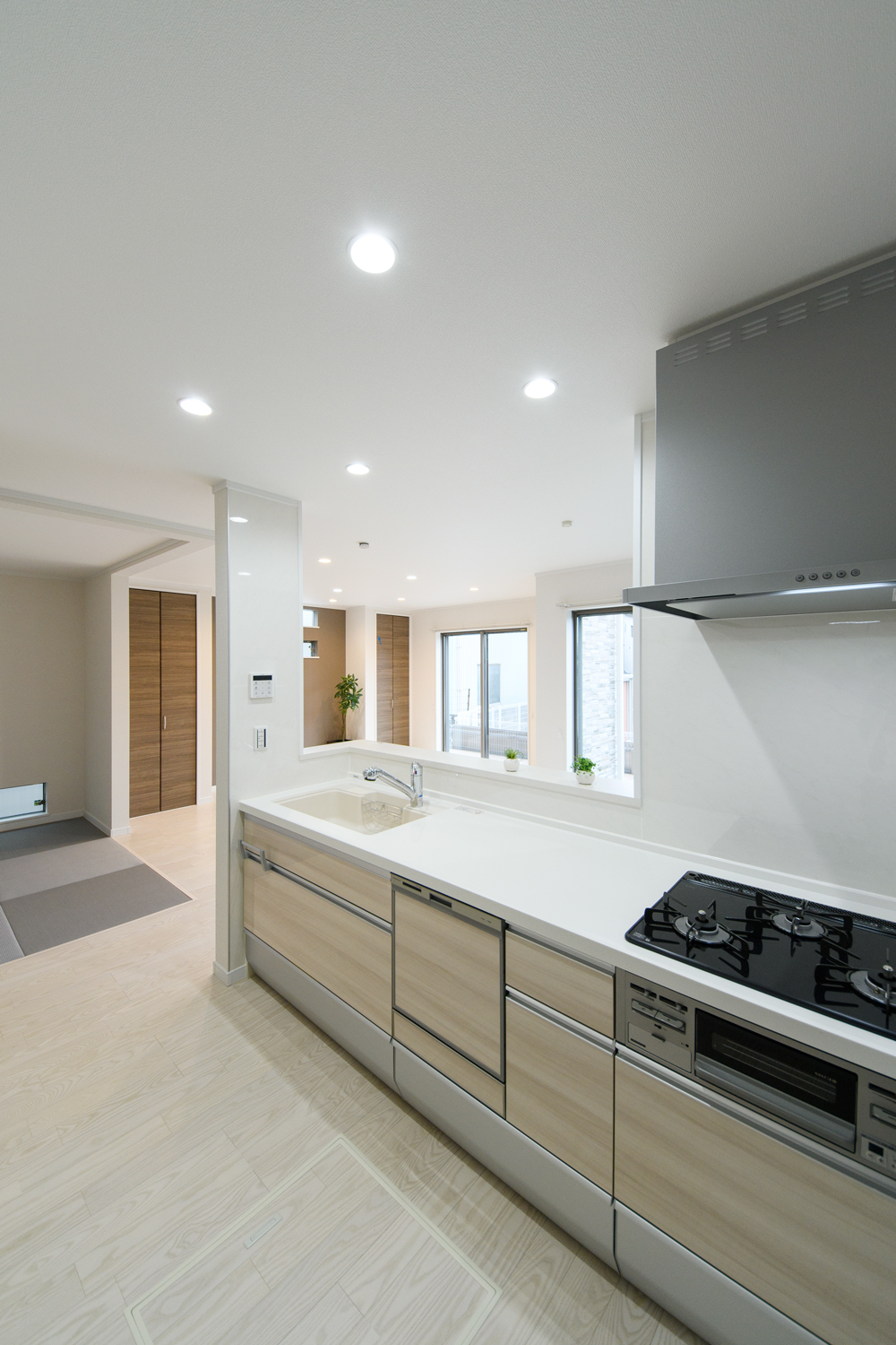 白木調のキッチン扉。明るく清潔感のあるキッチンに仕上がりました。