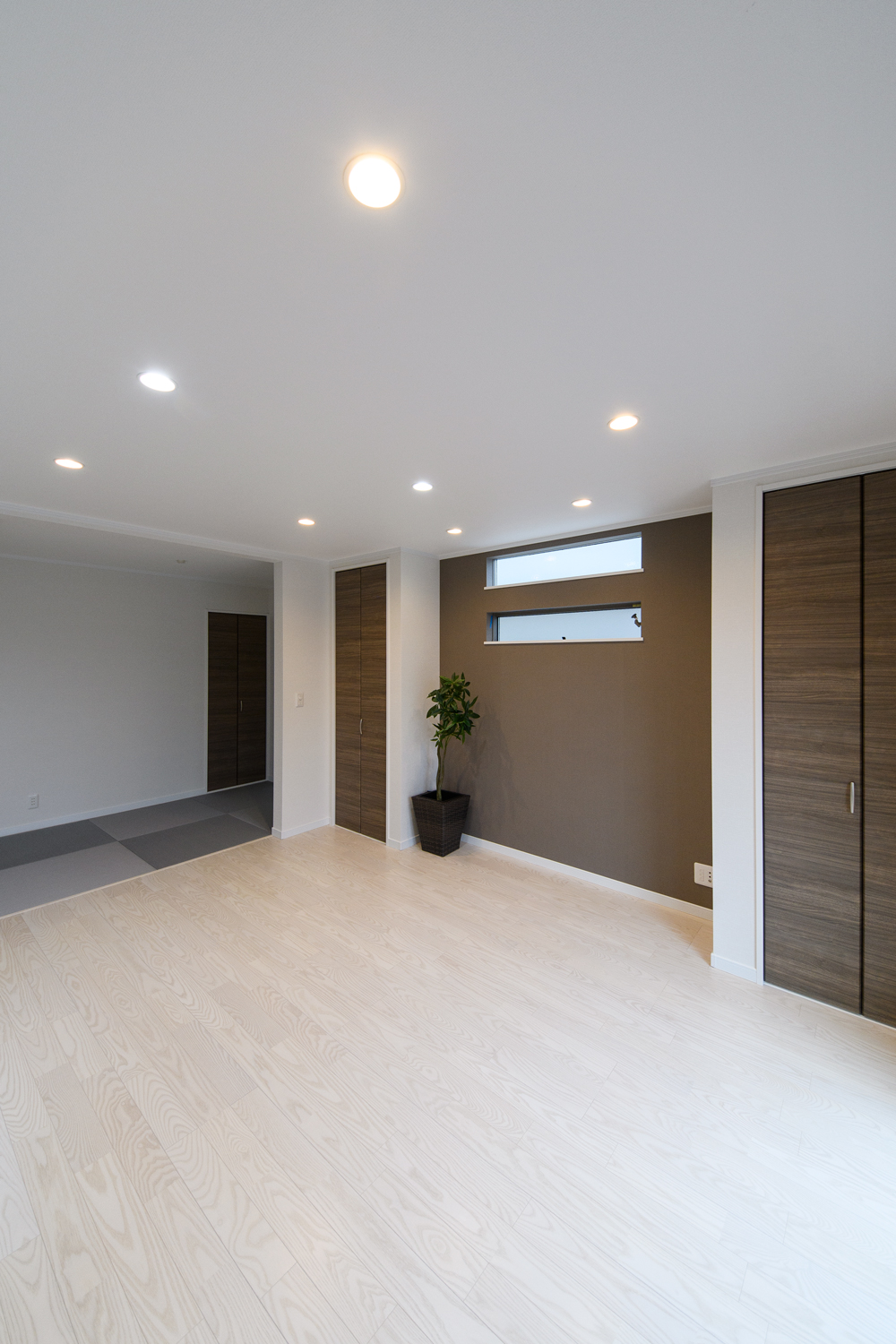 グレーのアクセントクロスが空間を引き締め、スタイリッシュで洗練された空間を演出。