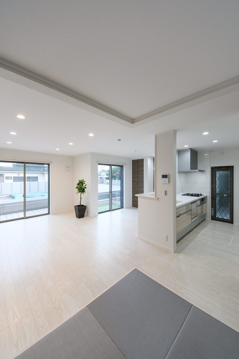 大きな窓から自然のやさしい光が降り注ぐ、明るく開放的なリビング空間。