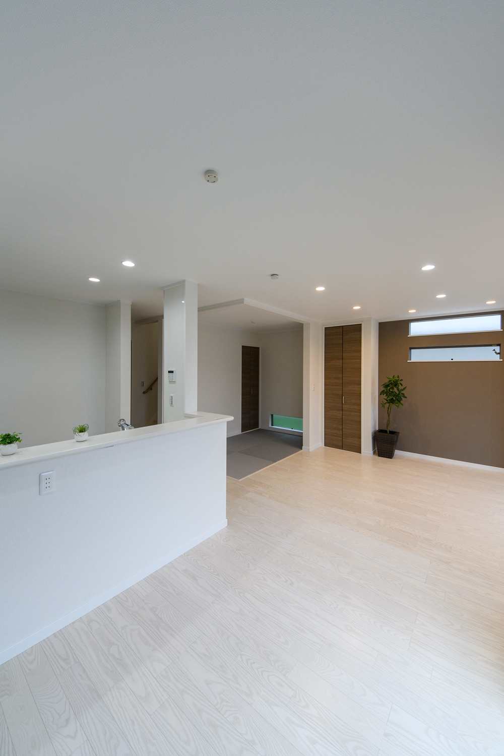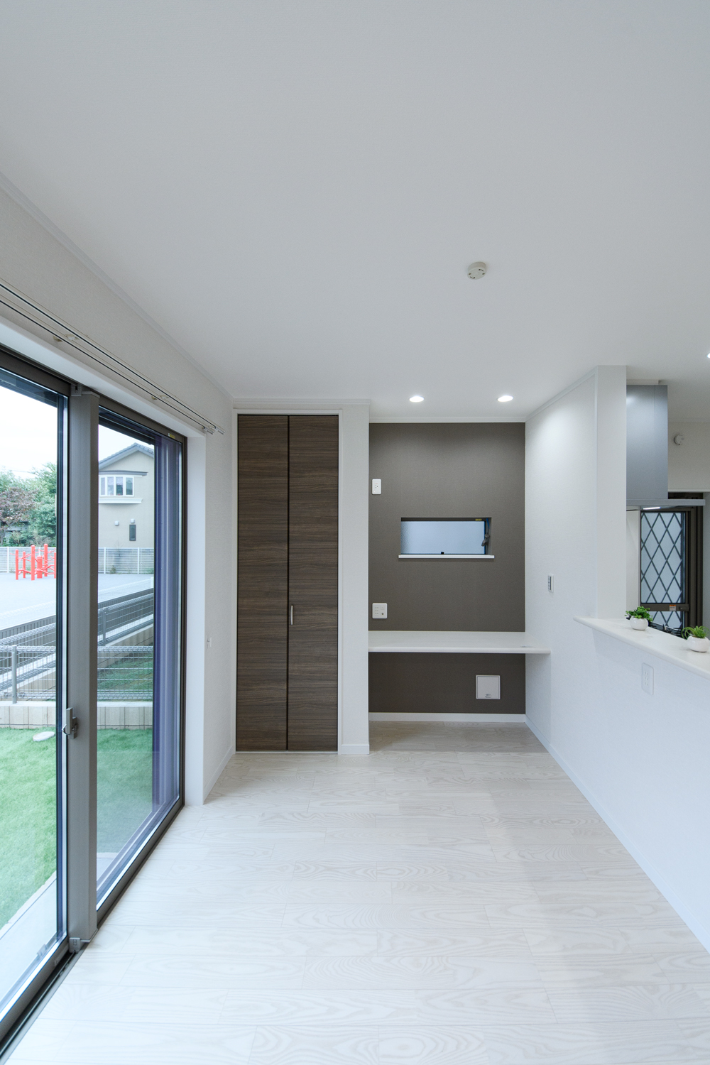 スタディコーナーやミセスコーナーとして利用できるカウンターを設置。アクセントクロスがモダンな表情を与えます。
