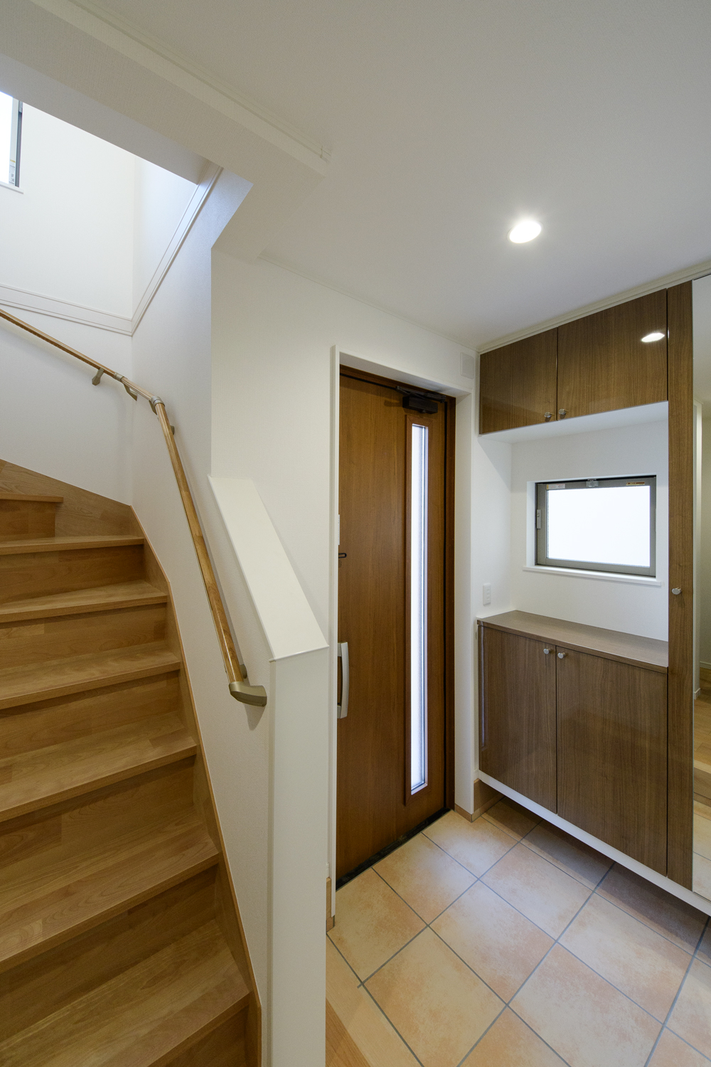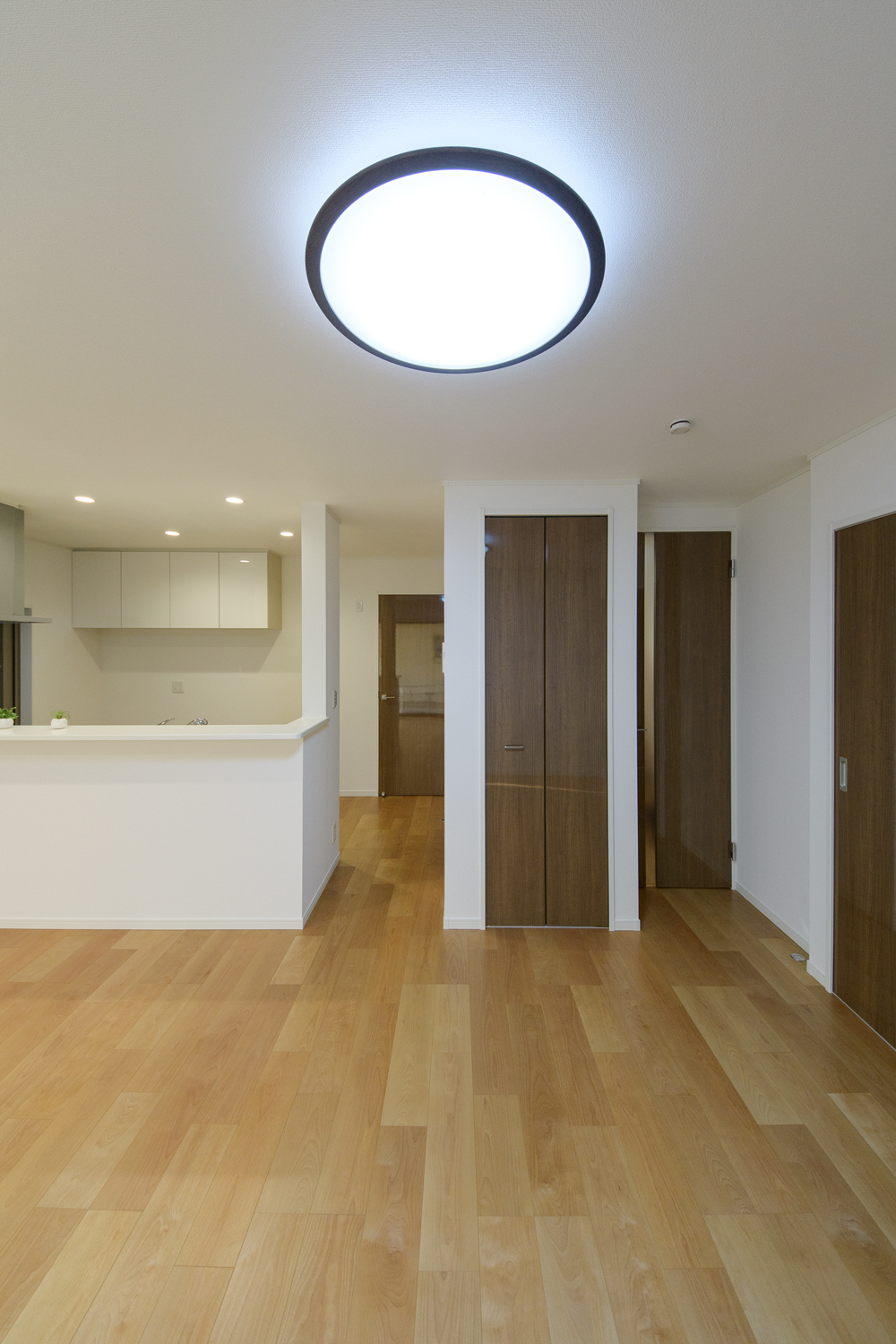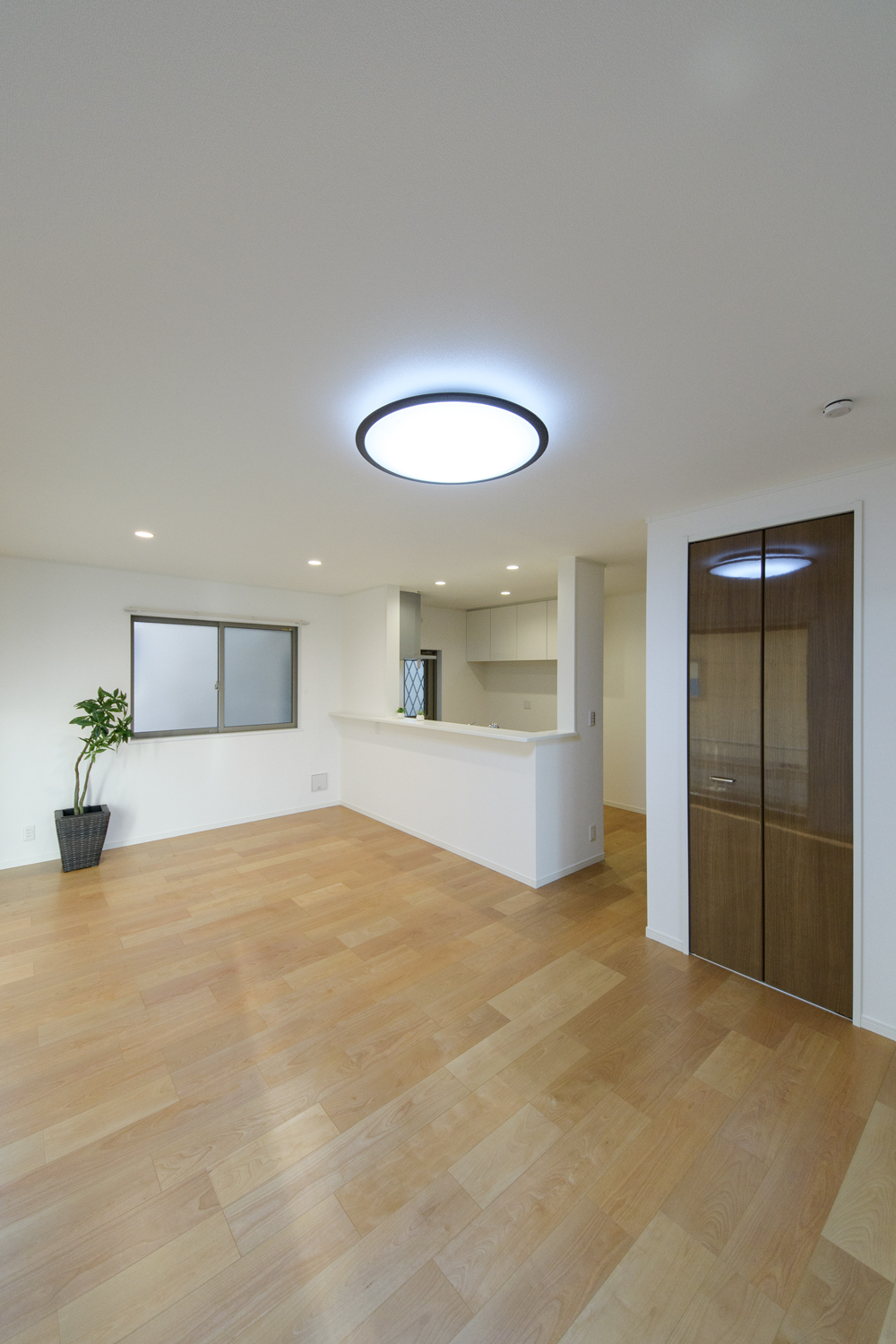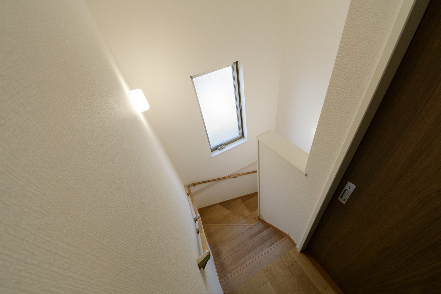 白を基調に温かみのあるオレンジの石目調サイディングをアクセントにした、ナチュラル&モダンな外観に仕上がりました。室内は大きな窓から自然のやさしい光が降り注ぐ、明るく開放的な住空間です。