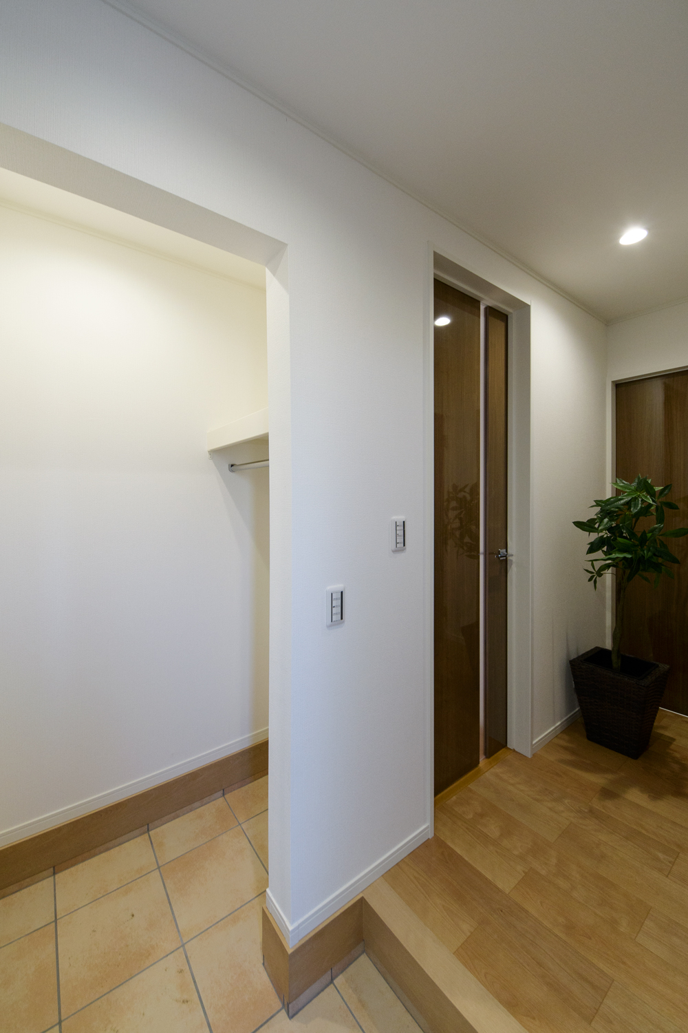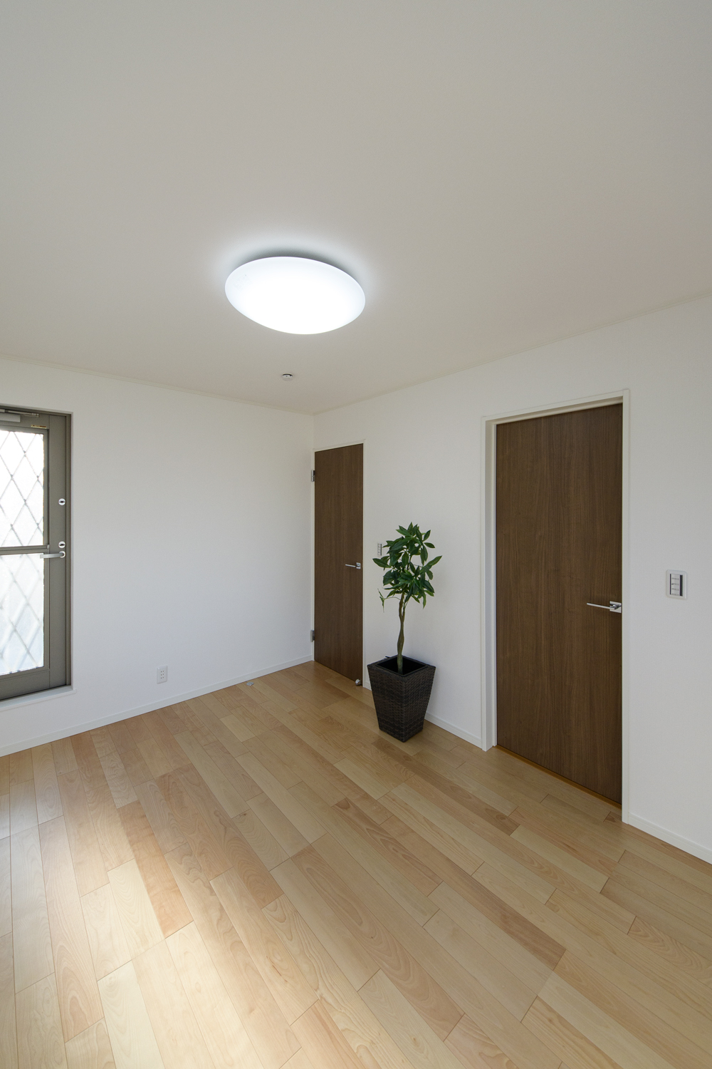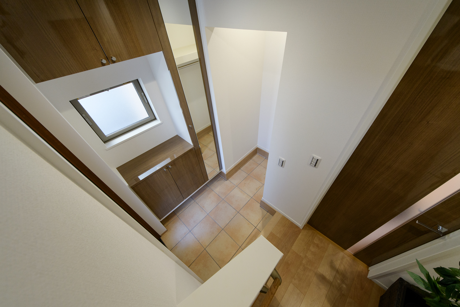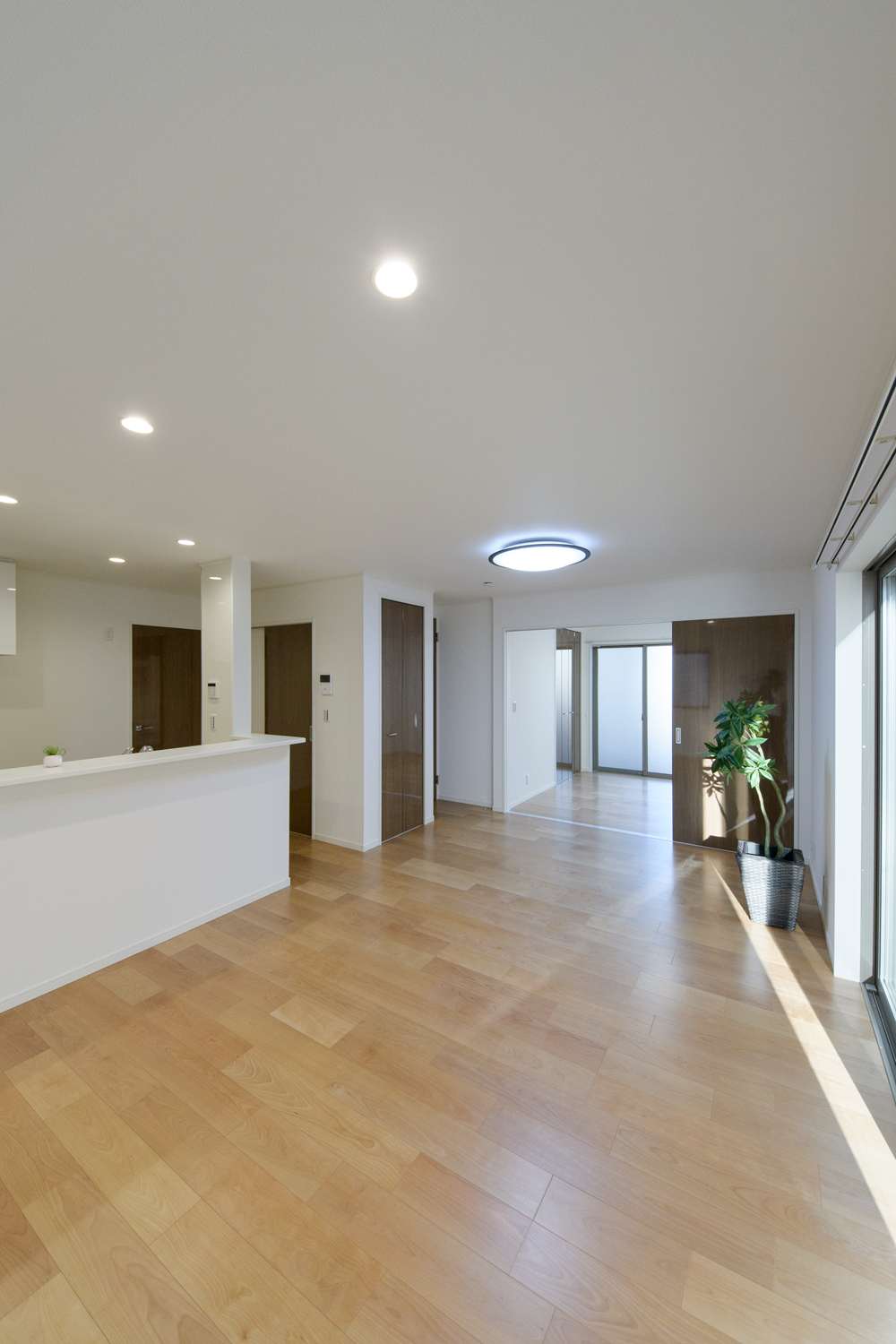 白を基調に温かみのあるオレンジの石目調サイディングをアクセントにした、ナチュラル&モダンな外観に仕上がりました。室内は大きな窓から自然のやさしい光が降り注ぐ、明るく開放的な住空間です。
