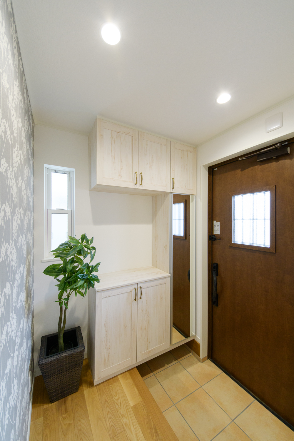 木の温もり感じる玄関ドアと収納、ベージュのテラコッタ調タイルが穏やかな空間を演出。