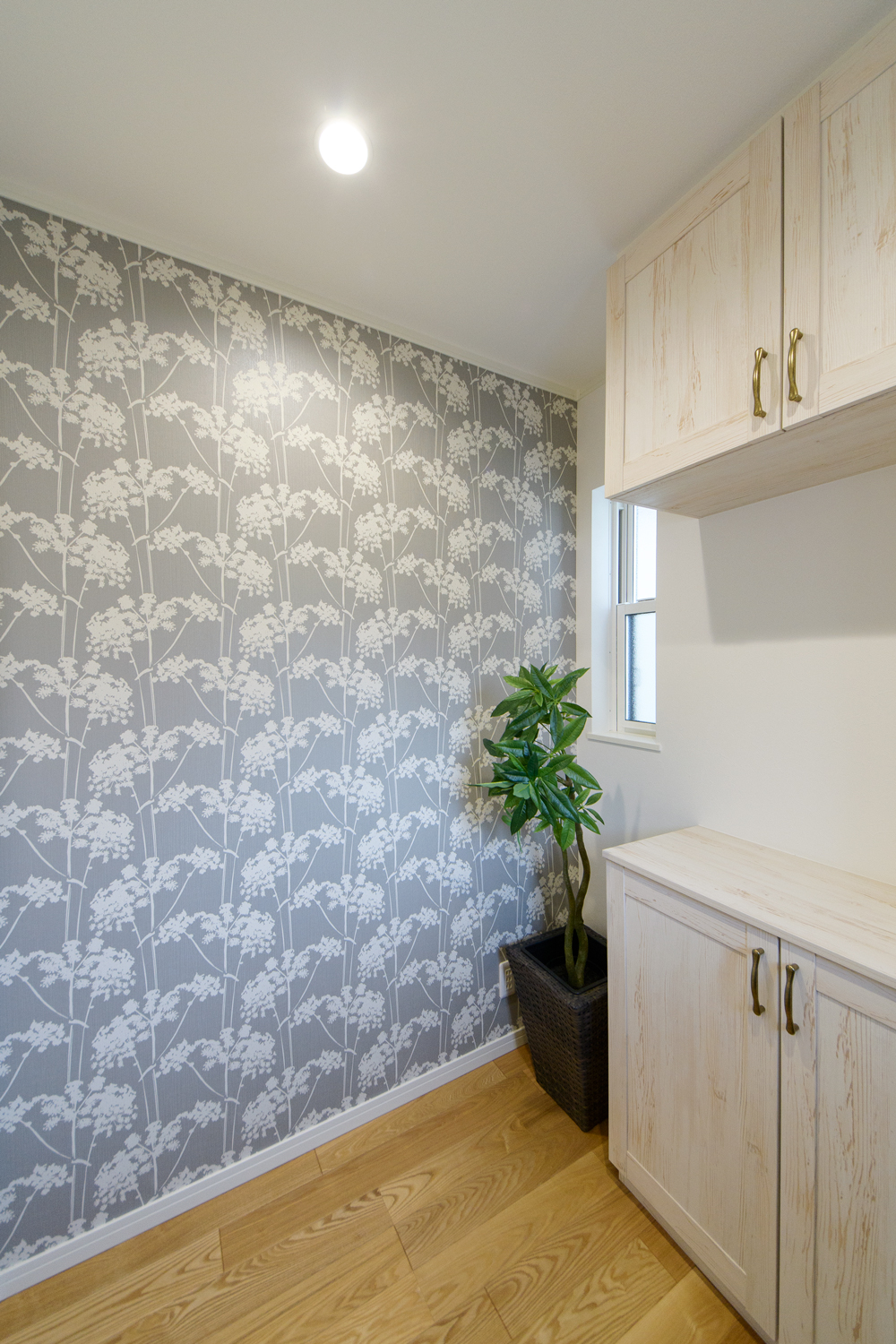 玄関を開けると視界に入るアクセントクロス。ニュートラルカラーの空間に優しさを添える北欧調の植物モチーフデザインです。
