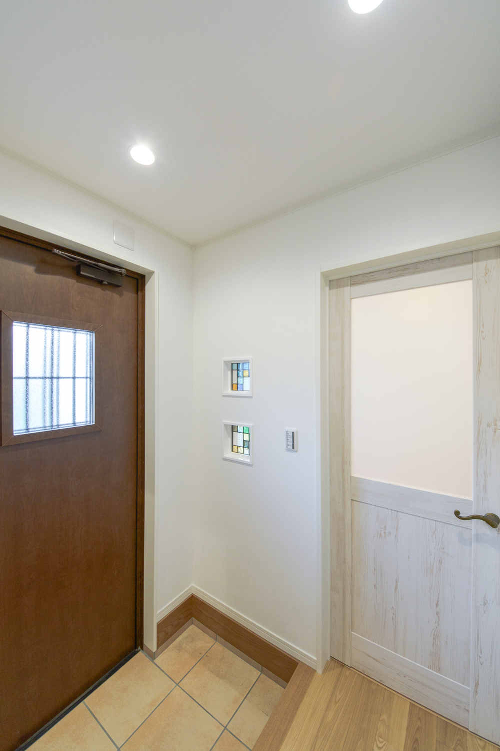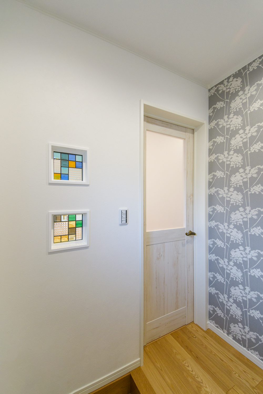 壁(玄関・リビング間)にステンドグラスを施しました。カラフルな光が空間を表情豊かに彩ります。