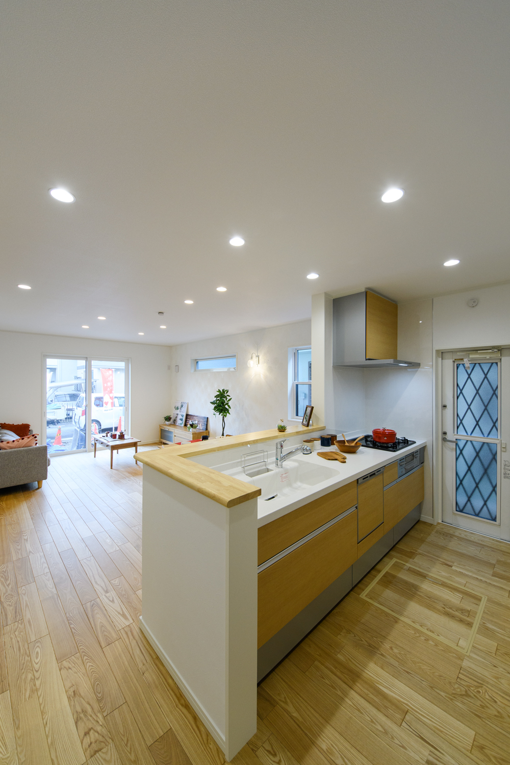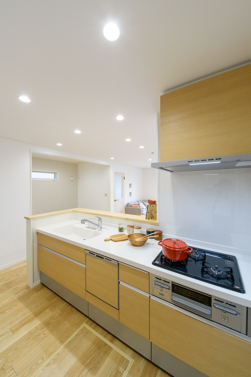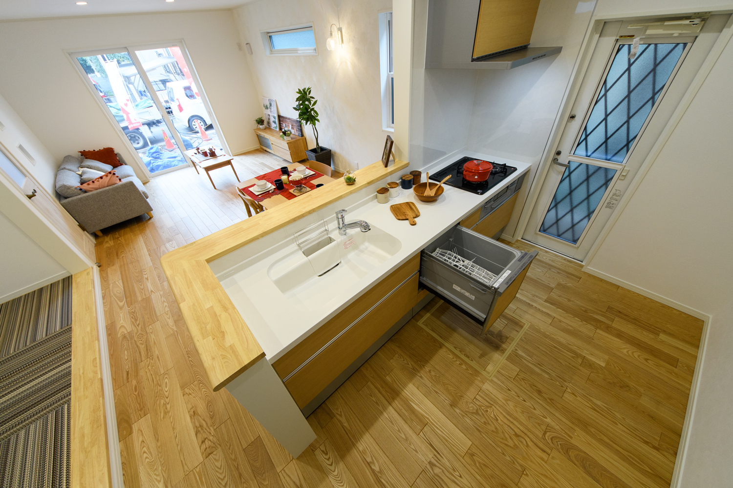 食器洗い乾燥機を施し機能美も優れた、家族を見守りながら家事がこなせる、カウンター付キッチン。