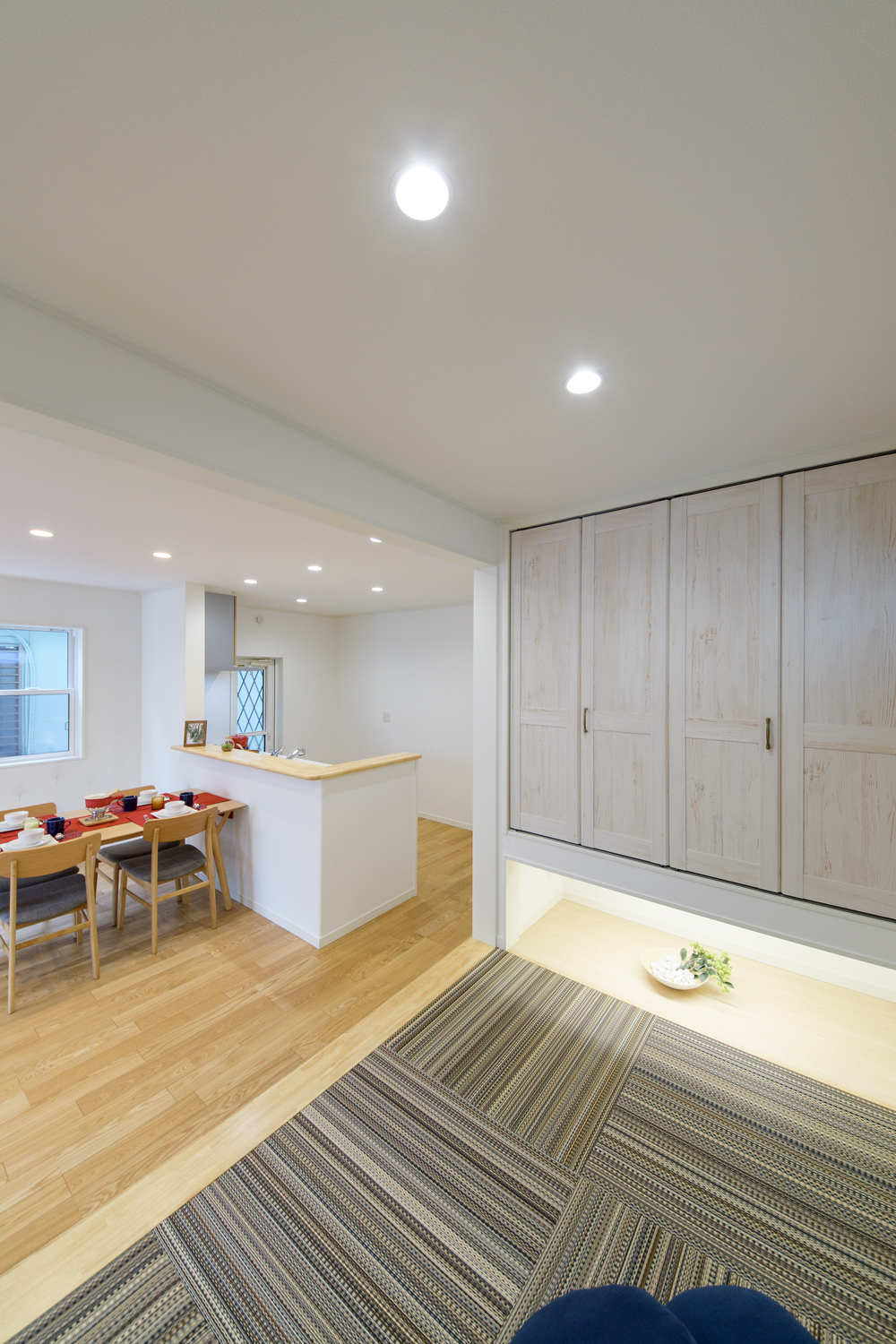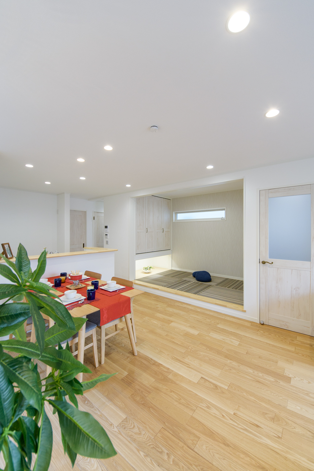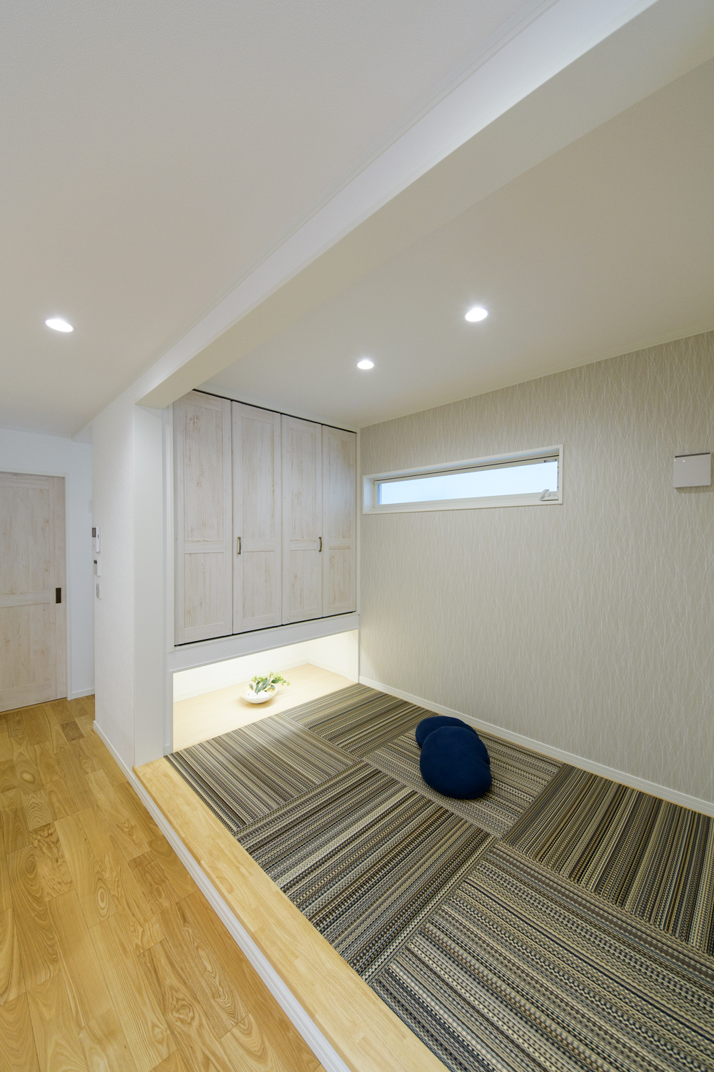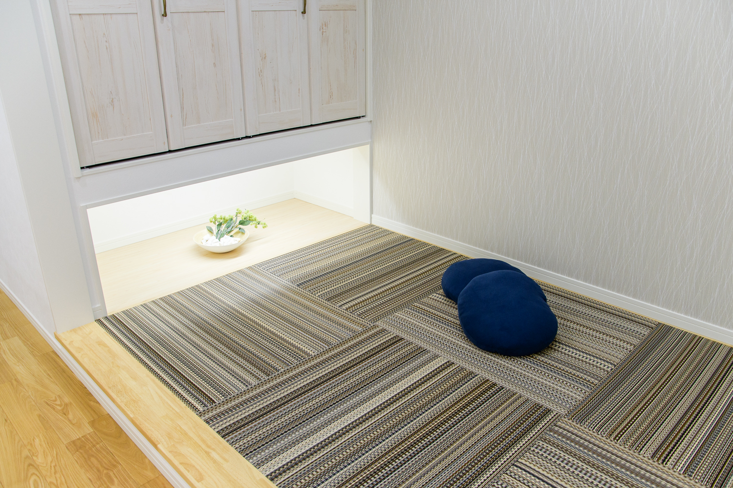 小上がりになった畳の間。表情豊かな色の畳を市松敷きにした、スタイリッシュな空間になりました。