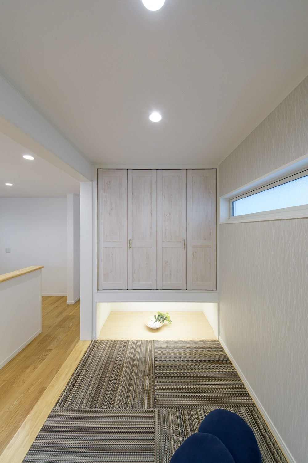 吊押入れの下に「縁甲板」を設え、間接照明でモダンな空間を演出。