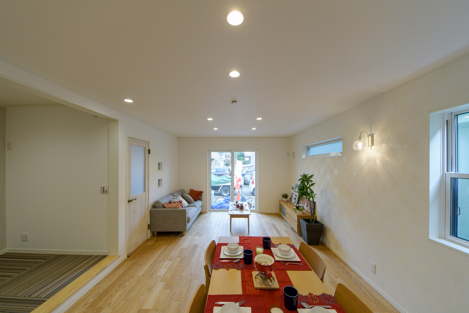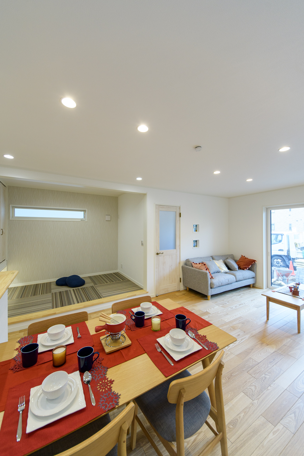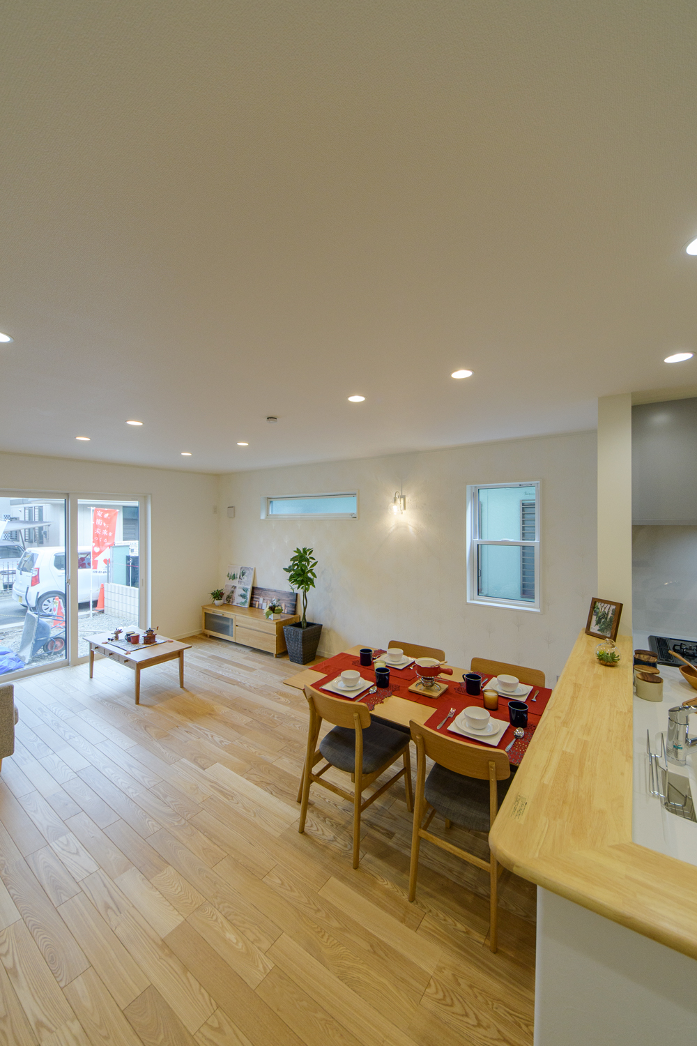 ダイニングセットとソファーセットを並べて置いても余裕の広さを確保したリビングダイニング。