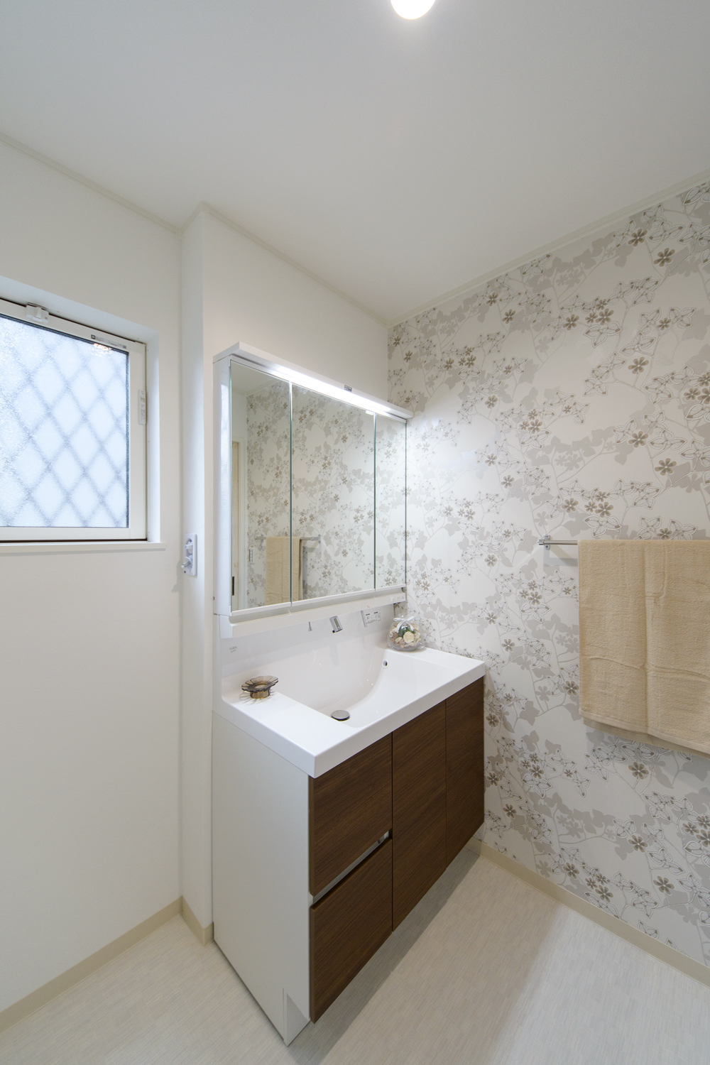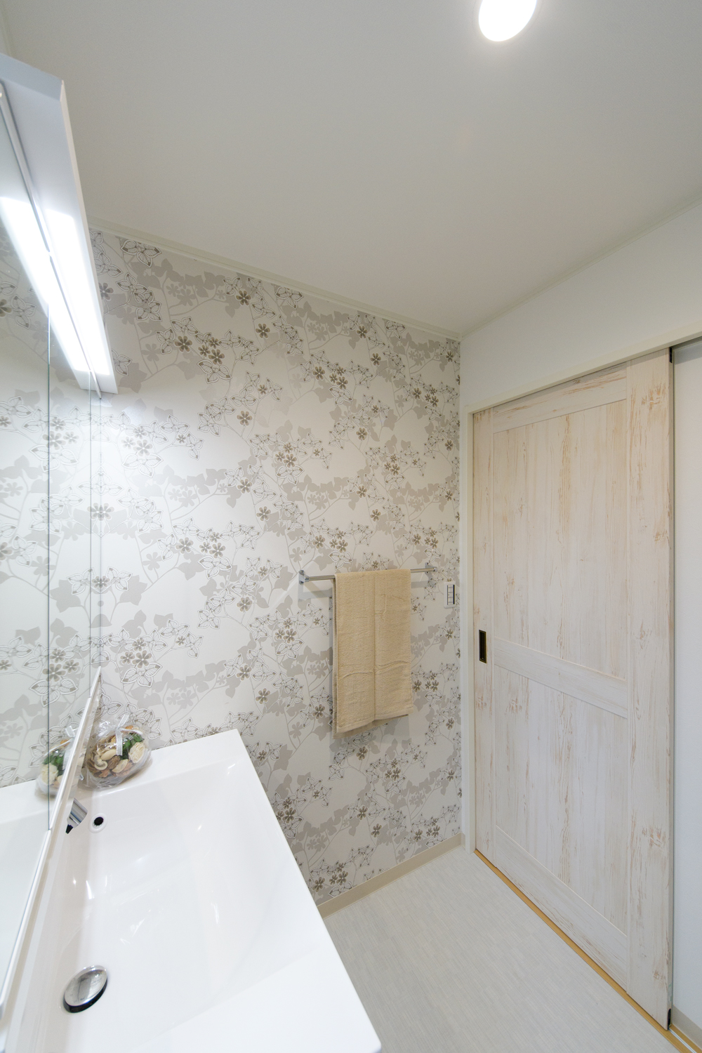 清潔感のあるサニタリールーム。北欧フィンランドで親しまれているのテキスタイルブランドのクロスをあしらいました。