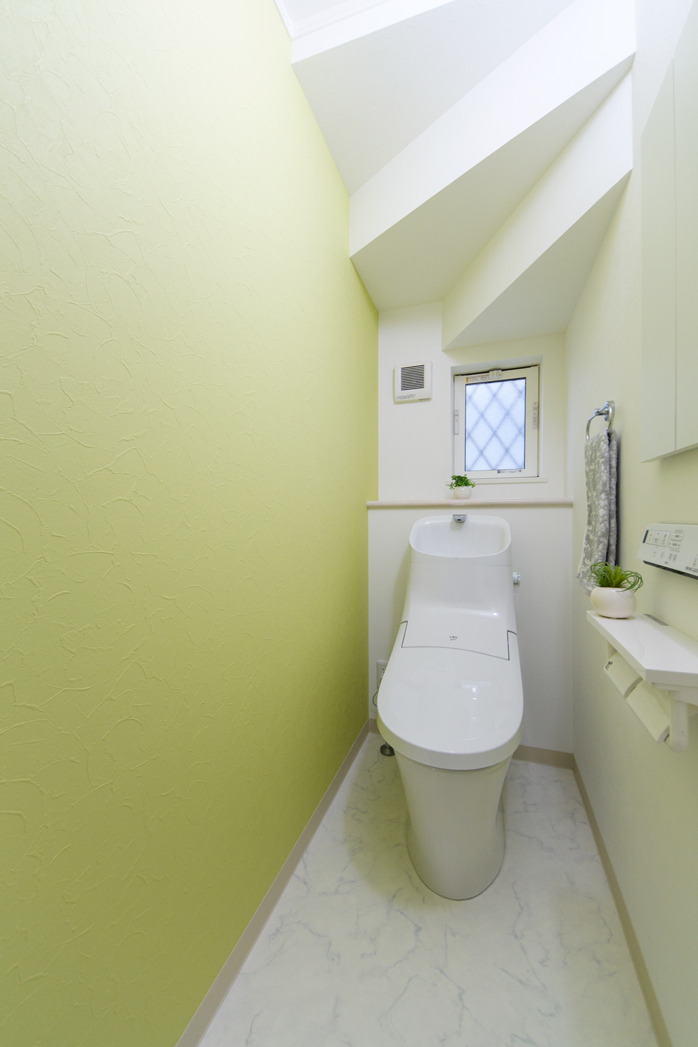 1階トイレ/レモン色のアクセントクロスが空間を彩ります。