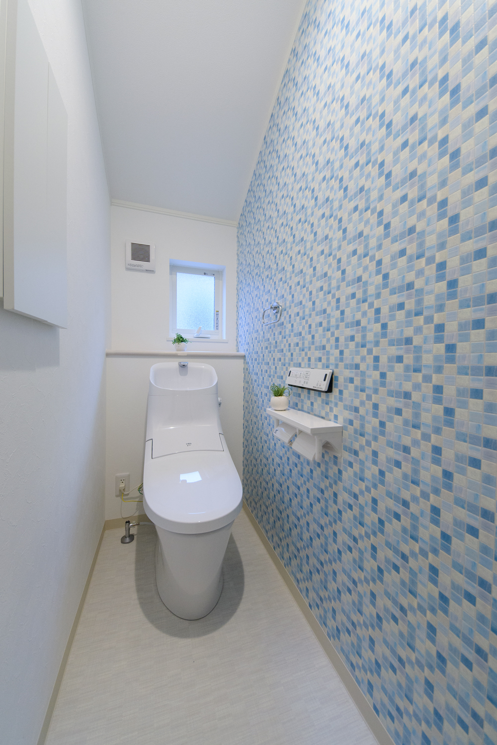2階トイレ/タイル調のアクセントクロスが爽やかな空間を演出します。