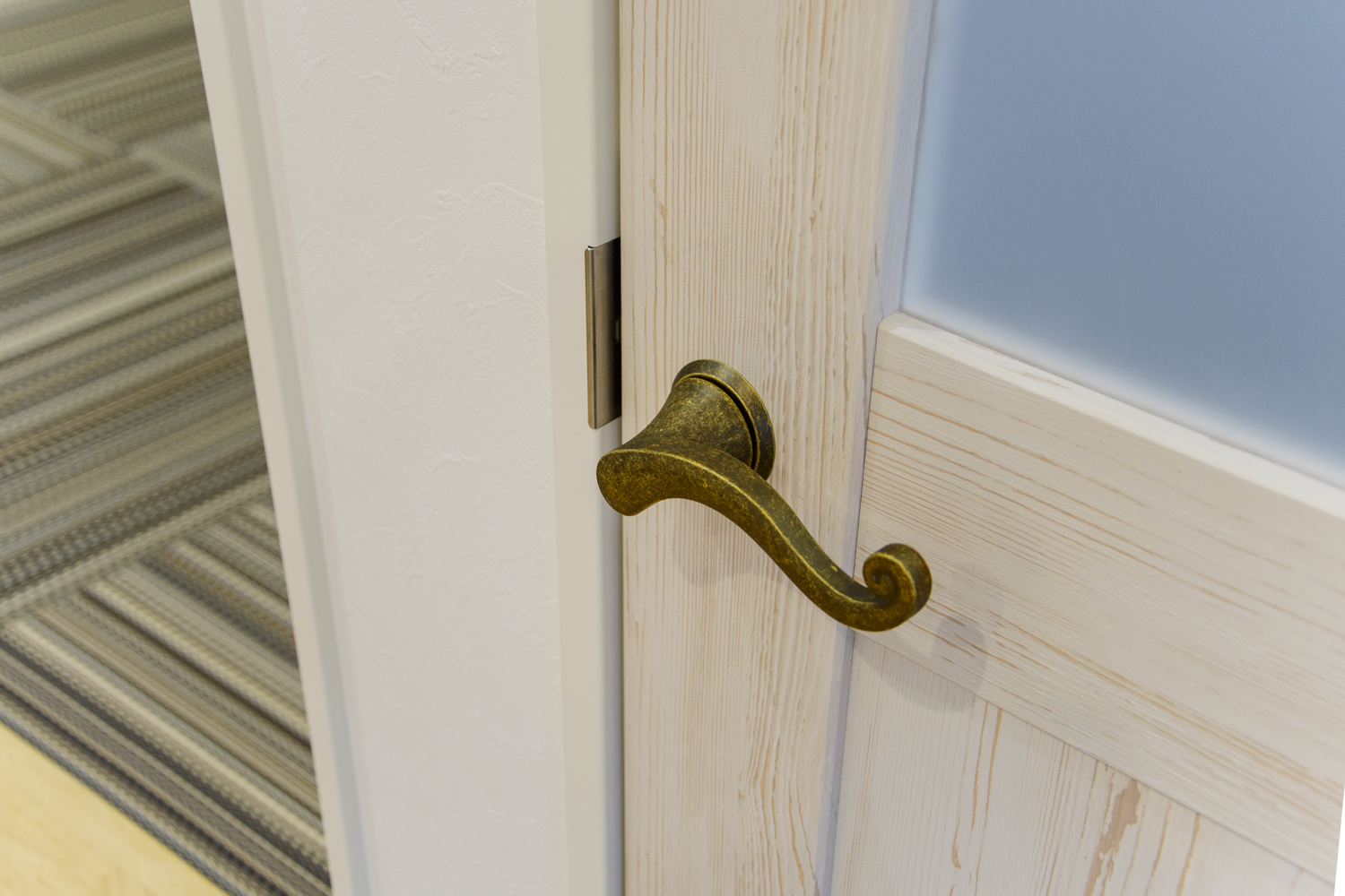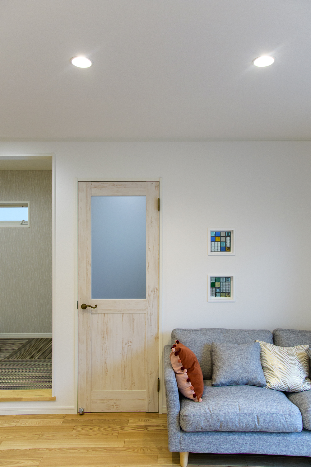 モザイクガラスを施したリビングドア。ゴールドのアンティーク調ハンドルを合わせ上質な印象になりました。