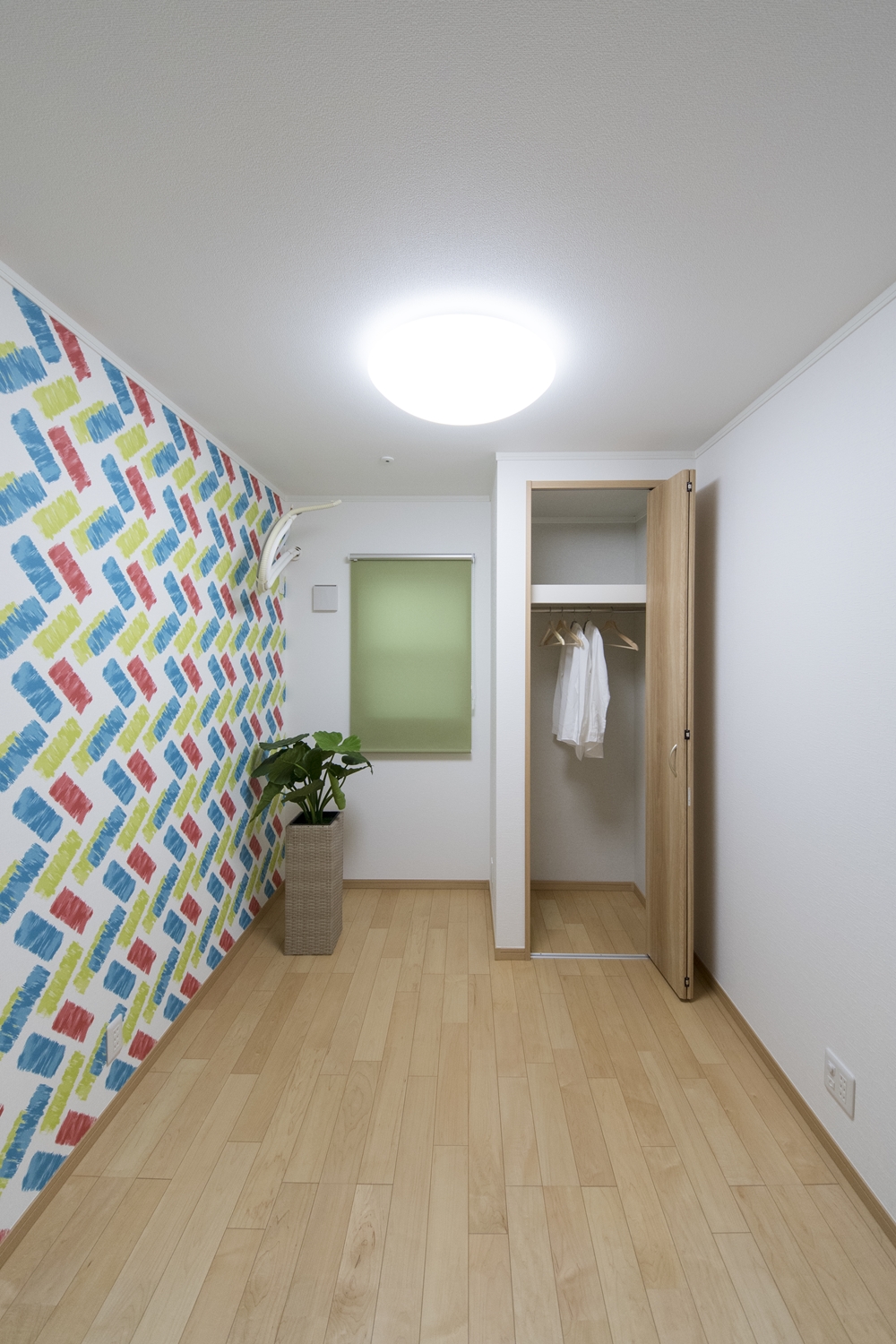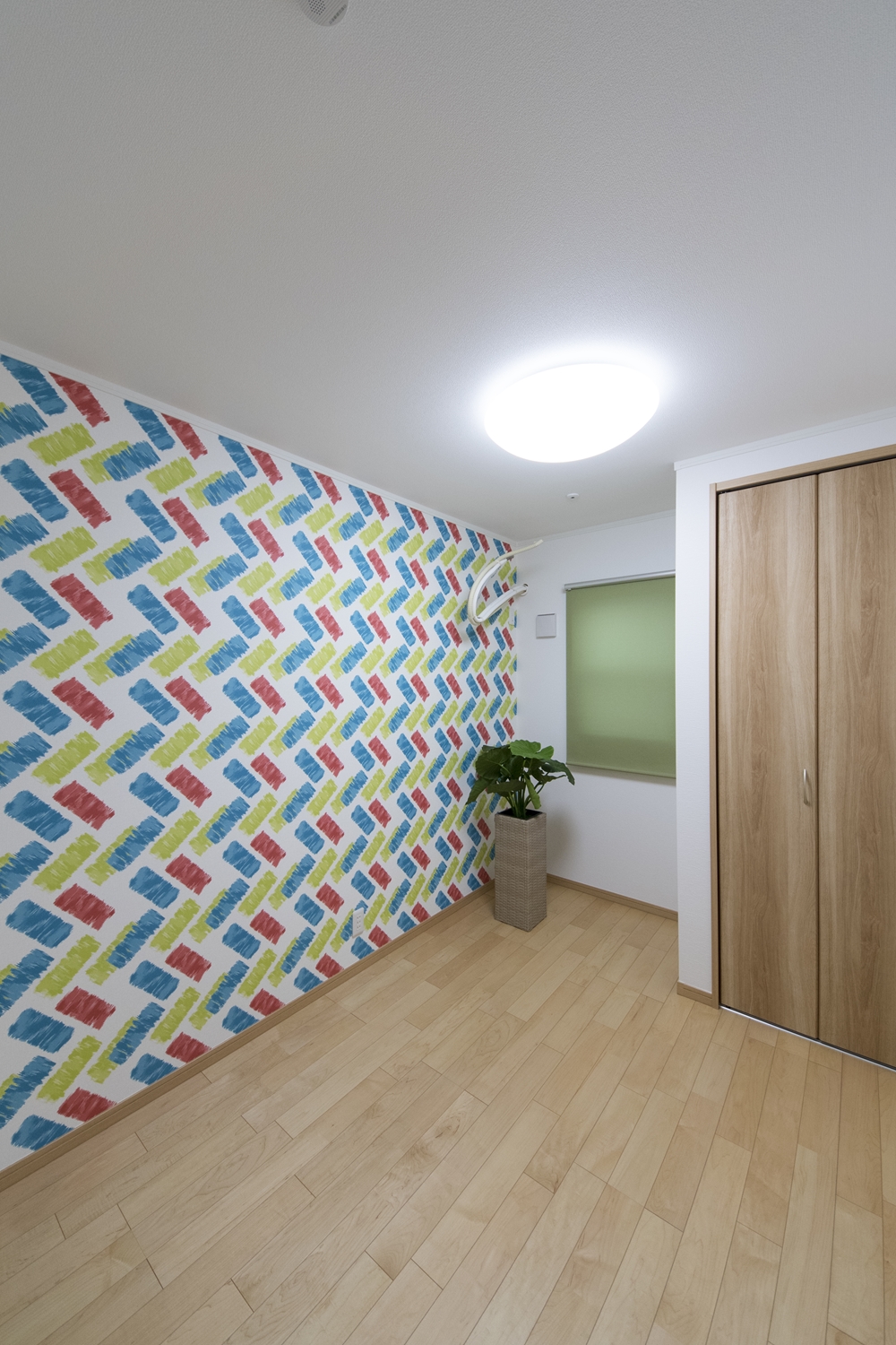 麻の葉模様のパターンを重ね合わせてデザインされた木目柄のアクセントパネルが上質な空間を演出します。