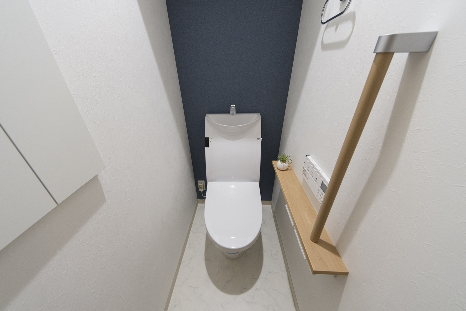 2Fトイレ/ネイビーのクロスをアクセントにしました。手すりを設置して安全で快適な暮らしをサポート。