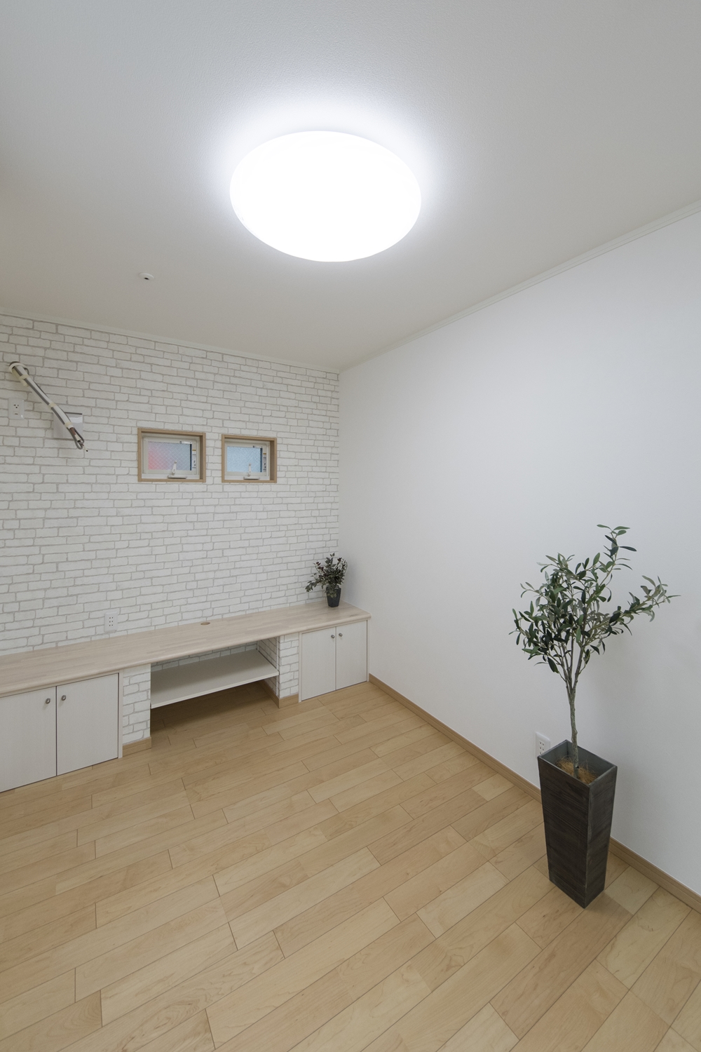 2Fリビング(子世帯)/レンガ調のクロスとTVボードは、キッチンカウンターとお揃いのデザインにしました♪