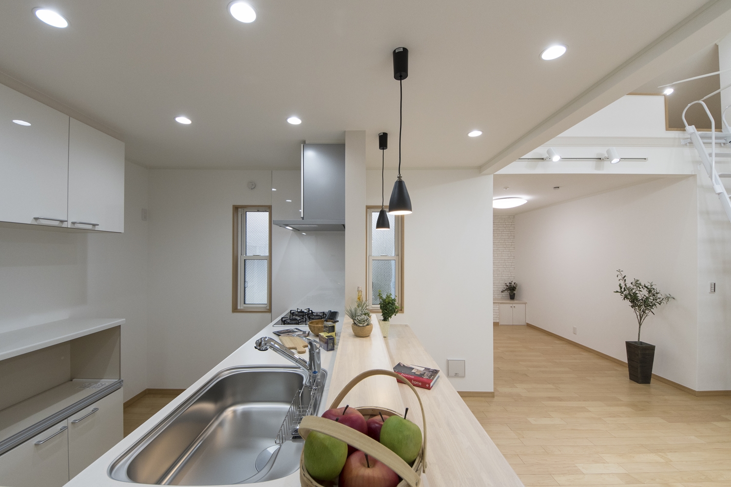 ちょっとしたティータイムにも利用できる、奥行きを持たせたカウンター付のキッチン。