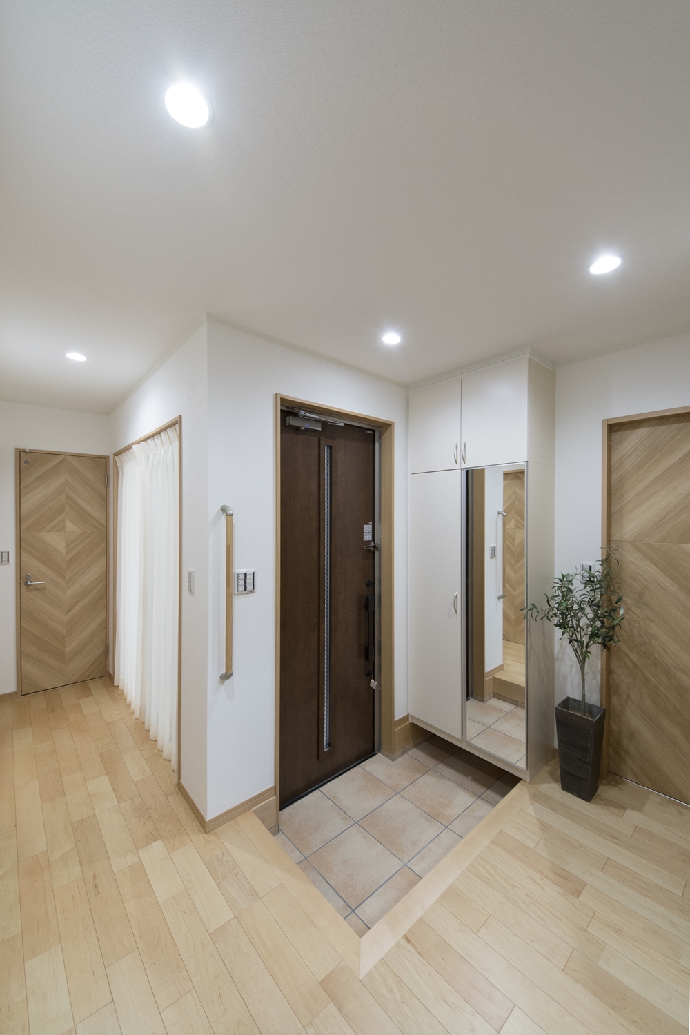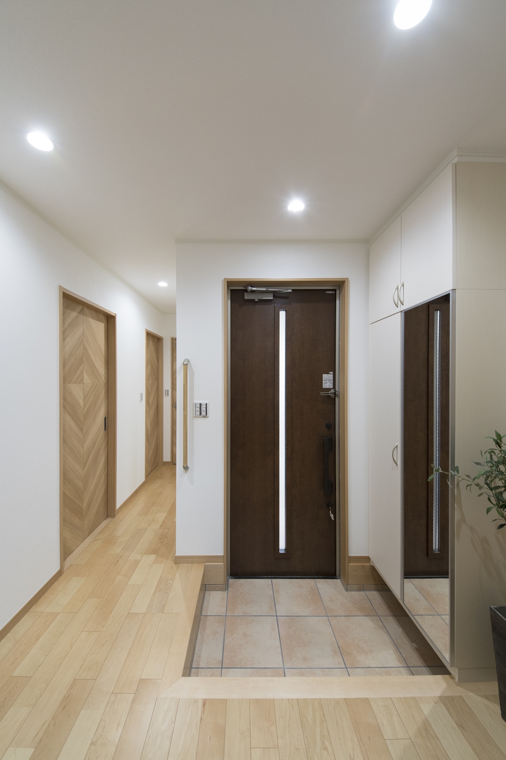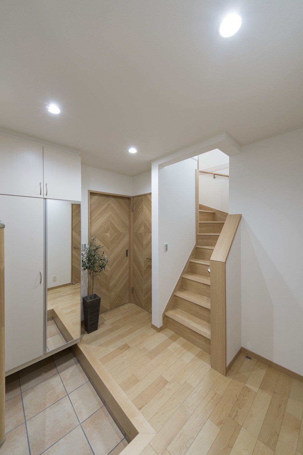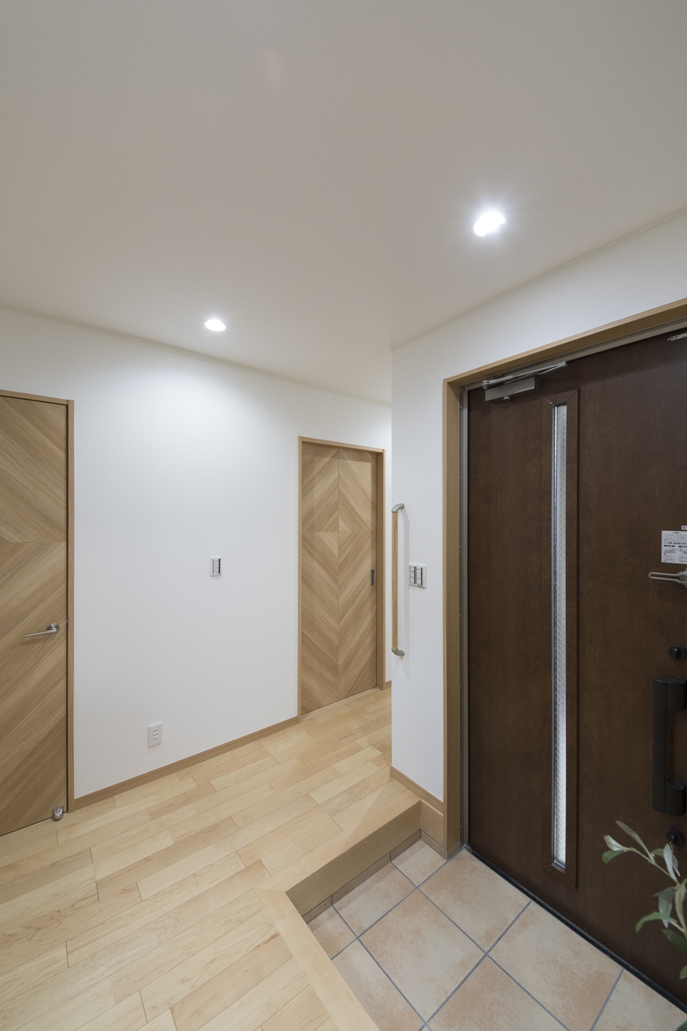 1F玄関(親世帯)/木の温もり感じるナチュラルな配色。昇り降りをやさしくサポートする手摺を設置しました。