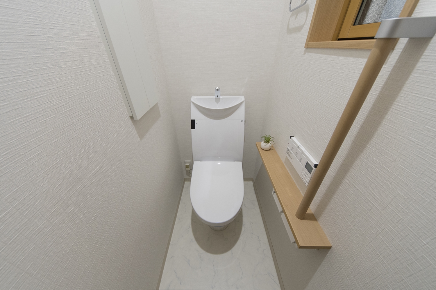 1階トイレ/白を基調とした清潔感のある内装。手すりを設置して安全で快適な暮らしをサポート。