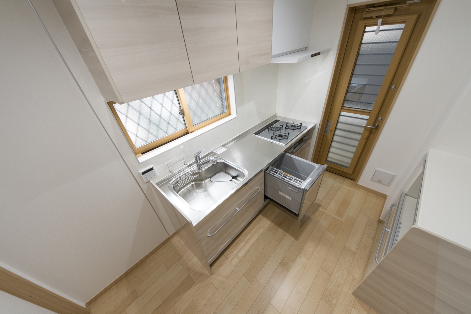 食器洗い乾燥機や、カップボード、吊戸棚を施した、見た目も使い勝手も優秀なキッチン。