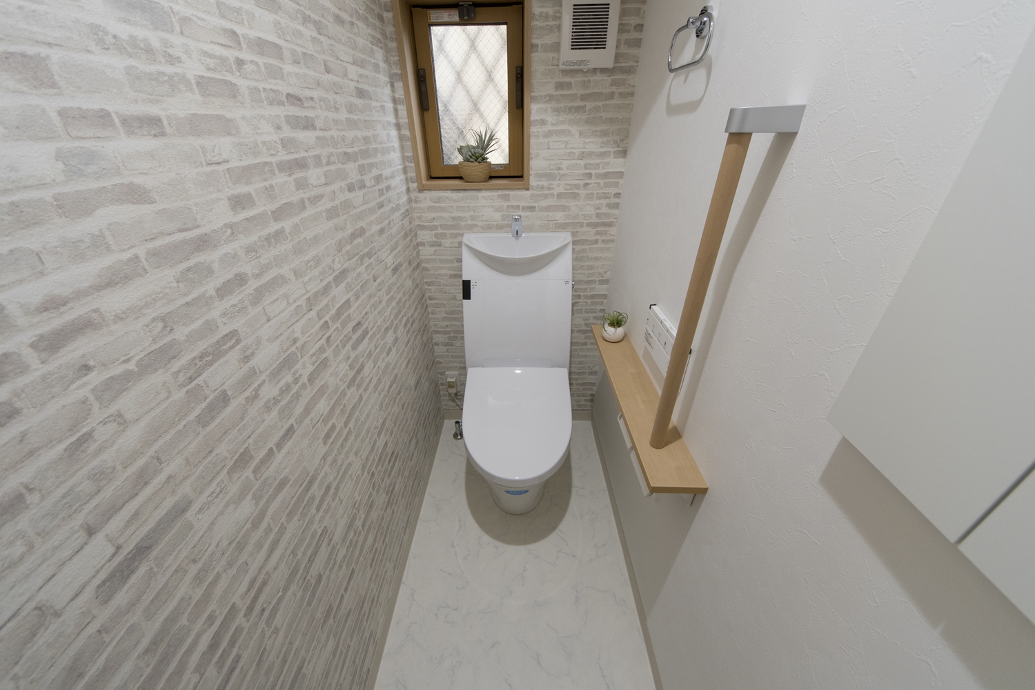 1Fトイレ/レンガ調のアクセントクロスを2面に貼ったオシャレな空間。手すりを設置して安全で快適な暮らしをサポート。