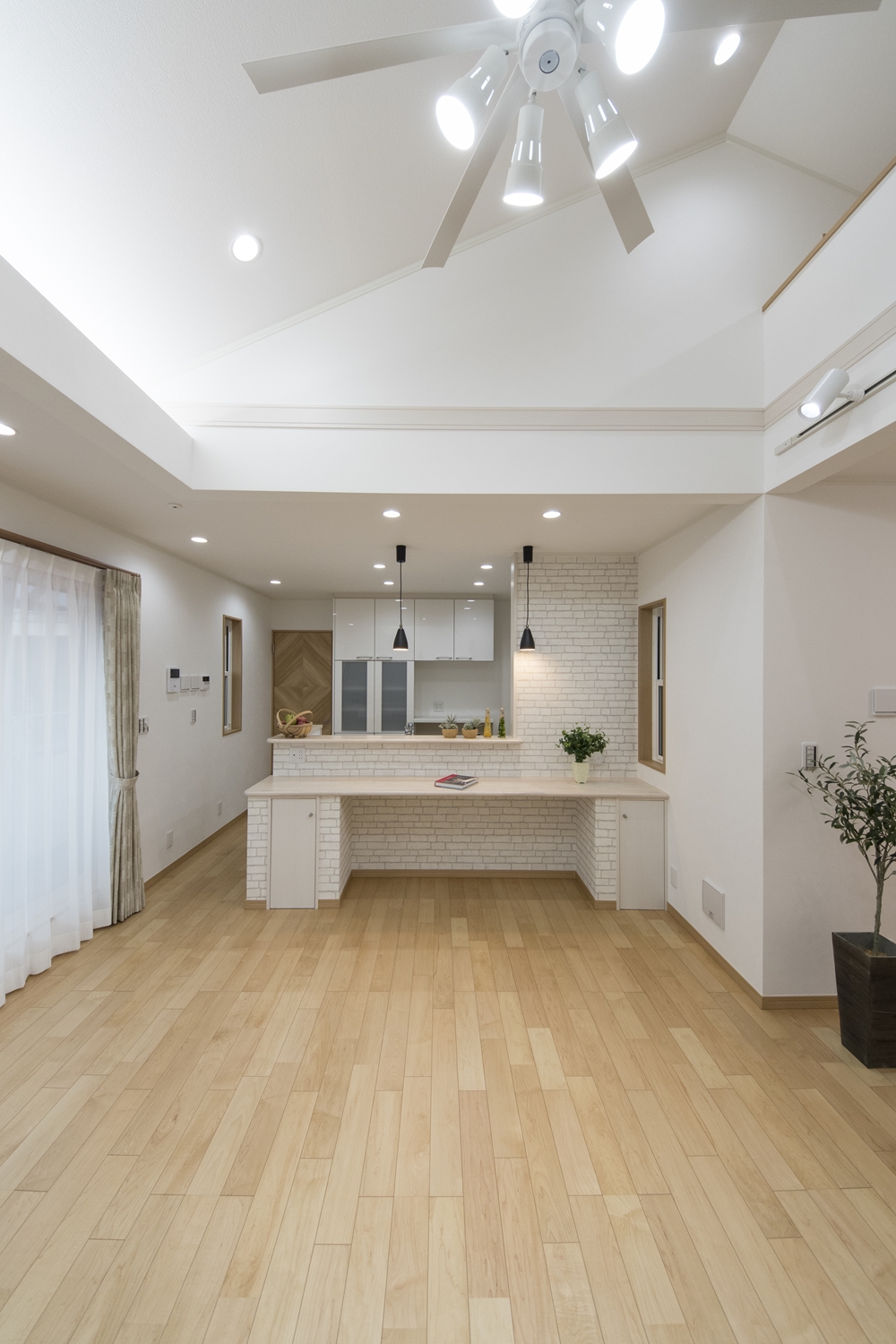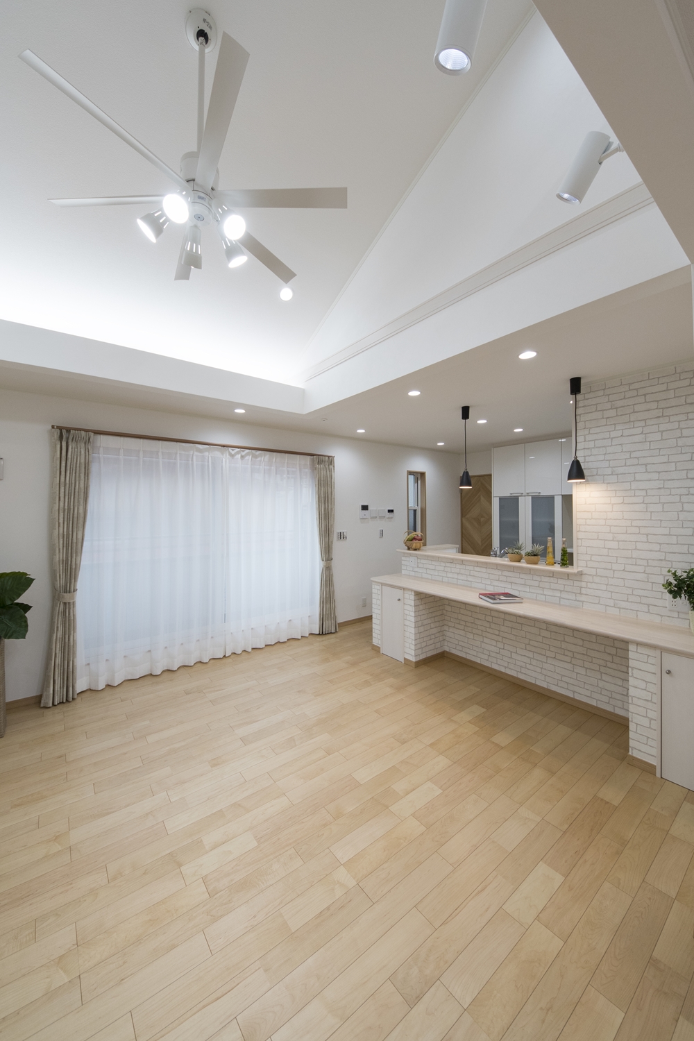 間接照明、ペンダント・スポット・ダウンライト、シーリングファン。それぞれ空間に合わせて使い分けたこだわりの照明。